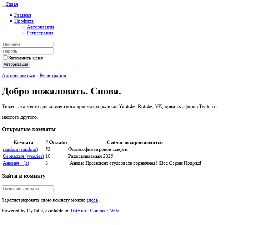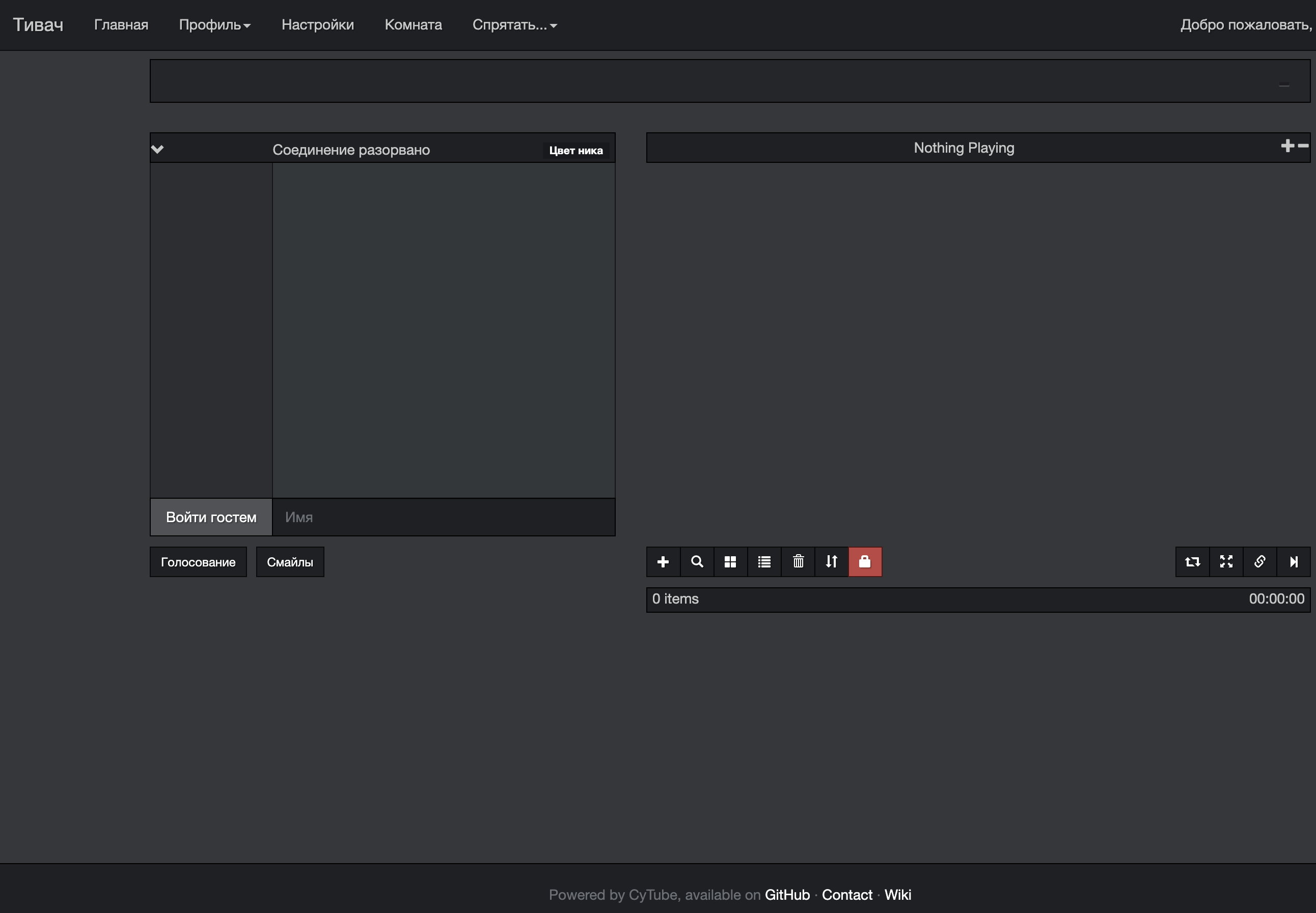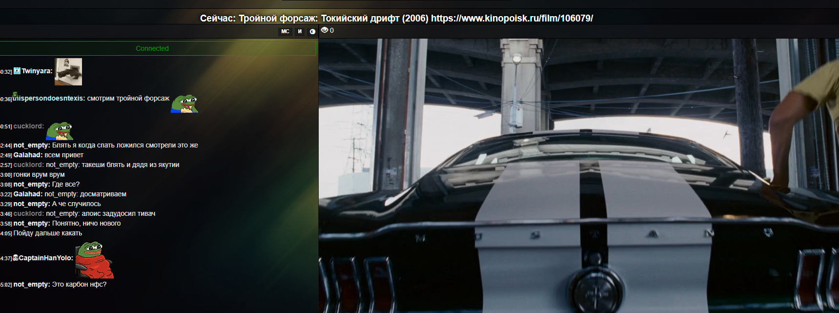 Вы можете зарегистрироваться, либо завести гостевой логин, чтобы общаться в чате. Гости ограничены в правах - они не могут голосовать за фильмы и заливать видео в плейлист, но зато они могут скипать их. Не ебите себе мозги - регистрация не требует подтверждения по почте, но если вы всё же хотите попробовать гостевой аккаунт, просто вбейте ник в поле под чатом и нажмите Enter.