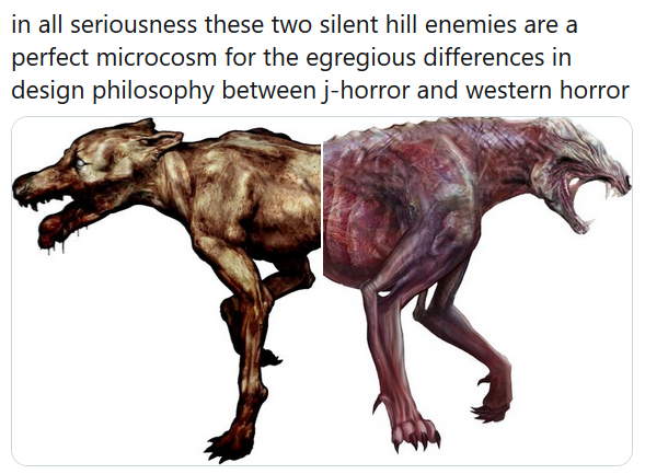 >>3750580 Собака справа "крутая", агрессивно-аэродиначиная, лоснящаяся, опасная. Собака слева больная, копчено-гнилая и сама, очевидно, страдает, несмотря на то, что в контексте игр и та и другая пытаются тебя схавать, конечно. Генерально, когда монстр/антагонист/ебака вощем сама деформирована, у нее болезненное выражение лица и/или странные нечитаемые движения - это как минимум вызывает более сложные чувства, чем когда просто "вот злая быстрая сильная хуйня, она тебя сожрет". Может тебе отчасти будет жалко эту неведомую дикую страдающую хуйню, пока она тебя нямкает. И конкретно в хорроре, на фоне остальных элементов, эти более сложные чувства почти всегда будут транслироваться в усиленное ощущение тревоги и всего такого, это добавляет ебанцы в атмосферу.