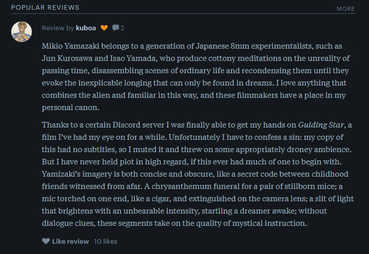 И, это, я японское кино... люблю. Потому я ищу достоинства фильма, хорошее в нем, в отличие от дурачка-критикана, выискивающего, по его мнению, недостатки (высасываемые из писюльки побратима, надо думать, настолько придирки нелепые и странные обычно) и так самоутверждающегося.