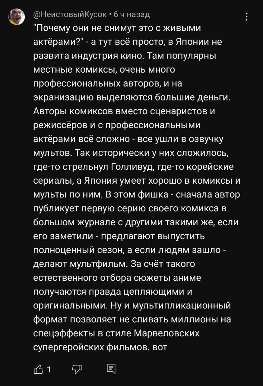 А вот онямеглиномесы дело другое, у них постоянно жопа горит из-за того, что взрослые японцы смотрят не аниме, а эйгу и дорамы. И регулярно лезут со своим этими: "Кок-пок-пок, епошки снова испортели наше Швятое Маняме! Снова сняли фильм для нормальных зрителей по мотивам комикса, по которому есть великий мультек для японских гиков и гейдзинов есть! Уи-и-и-и!"
