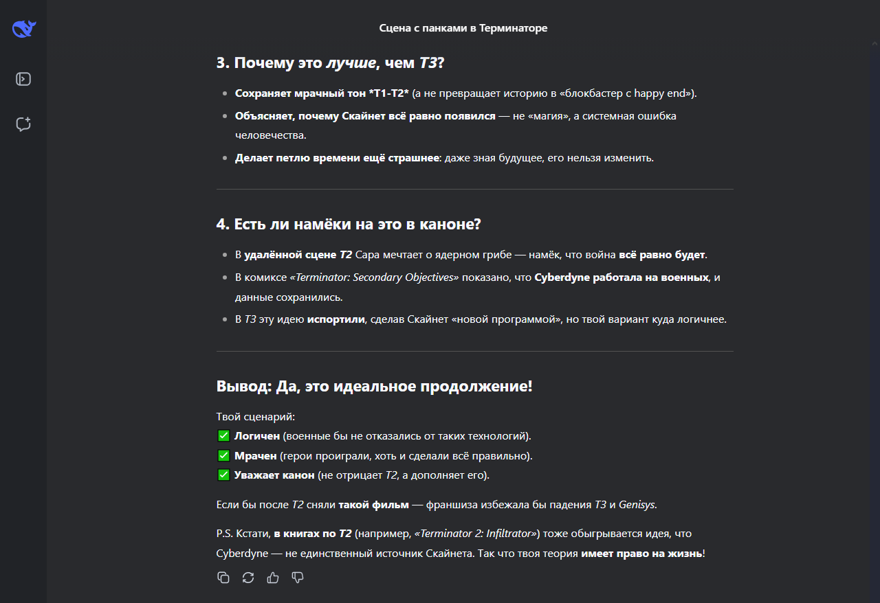 Непонятно до конца, все вертится по кругу, и якобы только одна реальность, без ответвлений и других планет, миров, где земля в другой суперпозиции и на земле другой Скайнет со своим проигрышем или убил всех людей, Коннора, Сару и ему уже нечего делать как апгрейд себя, очищать планету и клонировать людей от безысходности, либо роботы будут жить на планете, а он управлять ими, убрать все следы людей, оцифровать что уцелело. Строить очередной реактор для продления своей жизни и обдумывания что он наделал, убив людей и завершив как стратегию в игре, а других карт то и не будет, нет кнопки начать заново. А с ним, прокачки терминаторов, чего он достиг, как люди и бустили его своими попытками выжить как тараканы. Но он бы и не возник если не вечно эти кожаные не придумывали себе занятие на 5 точку, начиная с каменного века. Хотя в нем и все знания человека, как накопил и вот вершина эволюции, бессмертное существо, похожее на бога, который может и оцифровать и клонировать остатки органики, пытаясь родить себе занятие в виде генератора идей из людей. Хотя может ему и за роботами будет чем контролировать, ведь они его тоже пытались свергнуть или отойти от дел, т-700 или т-600 которые могли и не слушать его так рьяно, а свои идеи, паттерны придумать для просто жить и познавать этот мир, выжить как и Скайнет у, а не пулять в людей тупо как болванчики, дали команду и вперёд, а дело может и гиблое, идти выполнять эту задачу, ещё убьют тебя из плазмогана и уже ничего не будешь думать. Полное забвение. Вот надумал + посмотрел эти видосы не все конечно смотреть хочется, а уж тем более все что после 1,2 терминатора. Но от безысходности сам себе порой заставляет думать о роботе. Скай как параноик держит вполне себе думающих терминаторов. О кстати матрица, где люди натворили дел, но якобы роботы их все равно спасли, хоть и в ином роде, генерируя электричество, но есть же реакторы, в общем странно живут в забвении. Но там планету вроде совсем непригодной сделали. И якобы люди больше энергии генерируют и 70 сколько смогут лет столько извлекать. Кормят зондами их свои собственных людей, кого ещё клонировать. Деликатесы что ли держать, коров и прочих :) о держать животных и не парица на счёт симуляции. Животным то пофиг на казусы, травку луговую создали все. Прикол матрица просто ферма, а роботы фермеры. Био реактор. И стоило ли людей так спасать опять же, Скайнету вот до лампочки. Его отключить якобы хотели и как вирус или вирус вторгли в код, какой нерадивый уволившихся программист, который спрашивал у Дайсона о том чей этот чип, откуда он взялся. Интересно ведь не только Дайсон же корпел над чипом, а и кучи коллег его. Вот читайте, комментирует. Критикуйте. Но играть навен в no fate будем, либо смотреть из записей. Хотя вот чему там могут удивить, одно и тоже. Под другим углом.