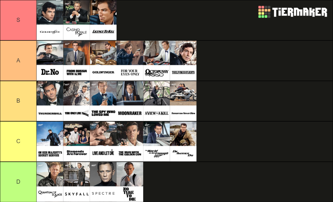 Странно, что "На службе ее Величества" до сих пор не отметмли. Вроде среди смотревших все фильмы признанный лучший фильм. Хотя тут наверное те, кто когда в детстве посмотрели Казино рояль, и он остался в их памяти как лучший.