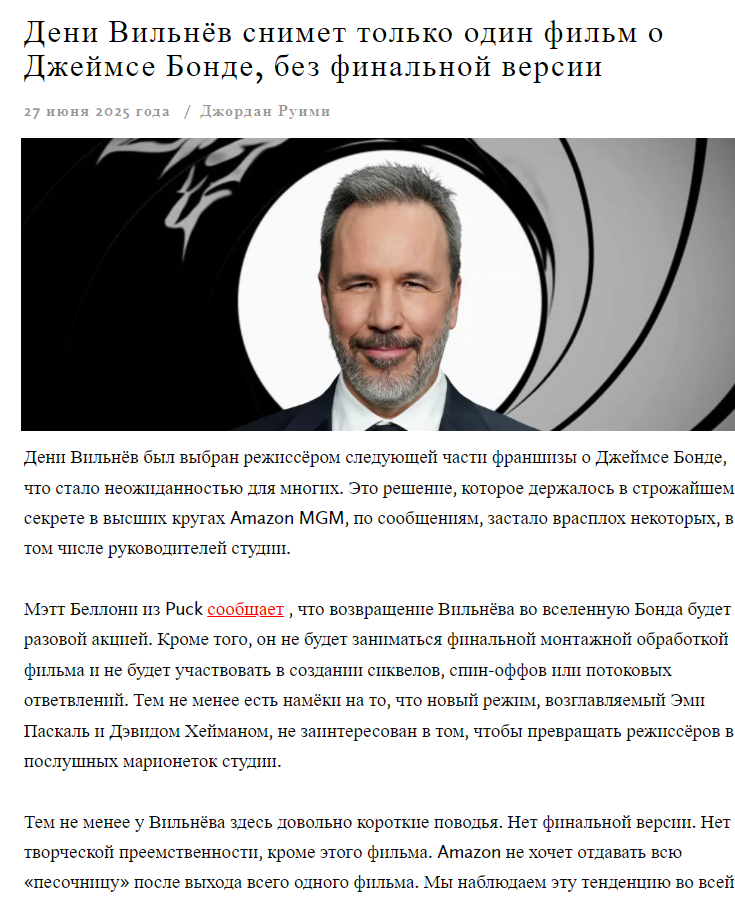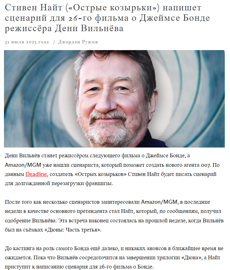 Гораздо интереснее, кого Вильнев потащит на роль Бонда. И тут чую я, может быть проблема - раз он Шаламе на роль Атрейдеса-младшего утвердил. Это реальный мискаст, причем серьезный.