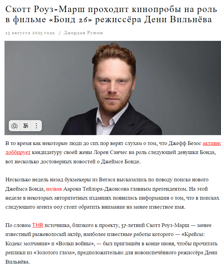 Я кратко расскажу обо всех основных новостях о облигациях за последние несколько месяцев, поскольку объем информации в этой теме ограничен, и никто не удосужился ее обобщить. Дени Вильнев и Стивен Найт - режиссеры и сценаристы "Бондианы 26", и говорят, что неизвестный РЫЖЕВОЛОСЫЙ актер по имени Скотт Роуз-Марш пробовался на роль Джеймса Бонда для этих двоих, но маловероятно, что он был выбран, и это, вероятно, один из сотен других. Прослушивание английских актеров. Я полагаю, что в конечном итоге будут выбраны Аарон Тейлор-Джонсон или Лео Сутер. Ожидайте объявления в октябре.