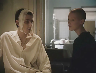 Главный герой замечает проходящего мимо военного. Военный ловит взгляд главного героя и опускает глаза. Правая сторона его лица обожжена. Военный идет дальше и выходит из кадра. Главный герой продолжает смотреть на то место, где стоял военный, будто в пустоту. Черный экран. Титры.