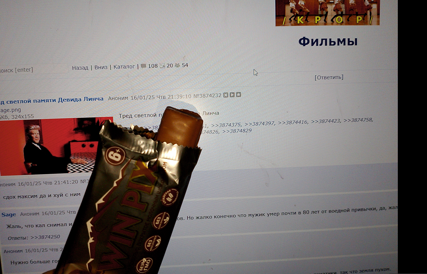 Твин Пикс нас поразил каким-то «иным всем». Одна девушка с района записала все серии на кассеты. У нас не было видака, иногда мы его выпрашивали, затем заходили к ней, она уже не спрашивала, зачем мы пришли, протягивала кассеты «до завтра или до послезавтра», и мы загружались Твин Пиксом. На хате с видаком и коврами, все серии подряд. Кто-то сказал тогда, что у режиссера есть еще фильмы. Да, но их никто не видел и их нигде не найти.
