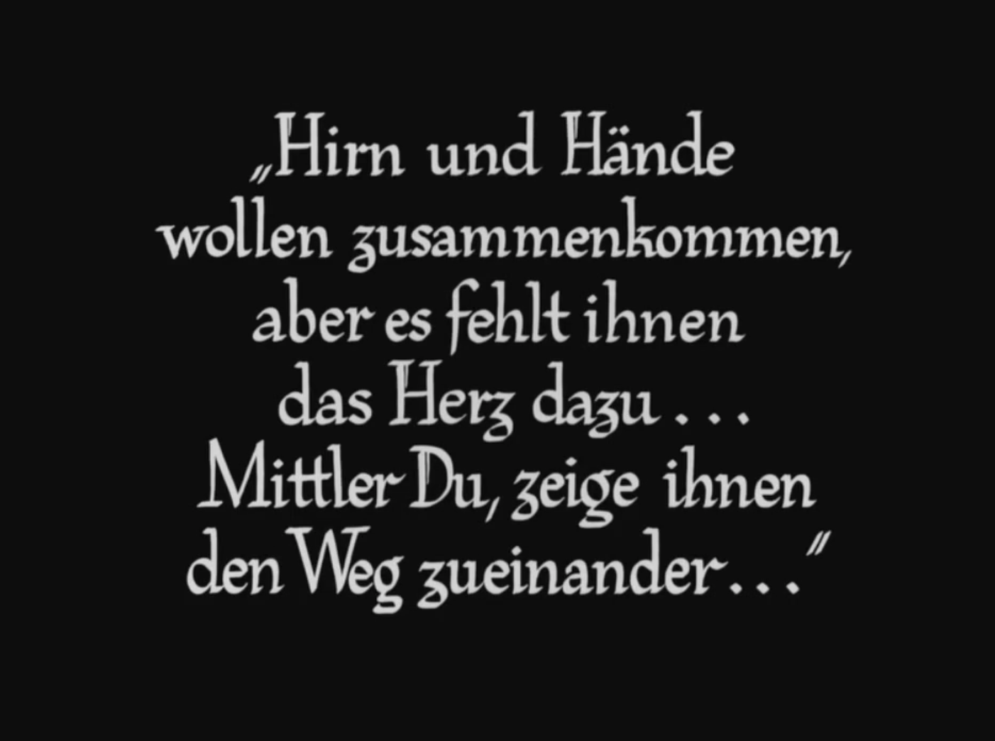 В фильме, кстати, сатанистом и колдуном является этот доктор с железной рукой, который использует популярные образы, но они же восходят к Фаусту Гете - пентаграмма на двери, создание искусственного существа - Гомункула. Богатеи там хорошие, учителка там хорошая, рабочие там хорошие, все хорошие, и в конце наступает союз Труда и Капитала, когда Главный Инженер Вавилона жмет руку Главному технику рабочего мира. Если и был в этом фильме средний класс, то это - мелкие друзья Сына Инженера. Цимес фильма - союз Труда и Капитала, даже не Капитала, а Власти, которая над Капиталом. Капитал там - как их соединение.