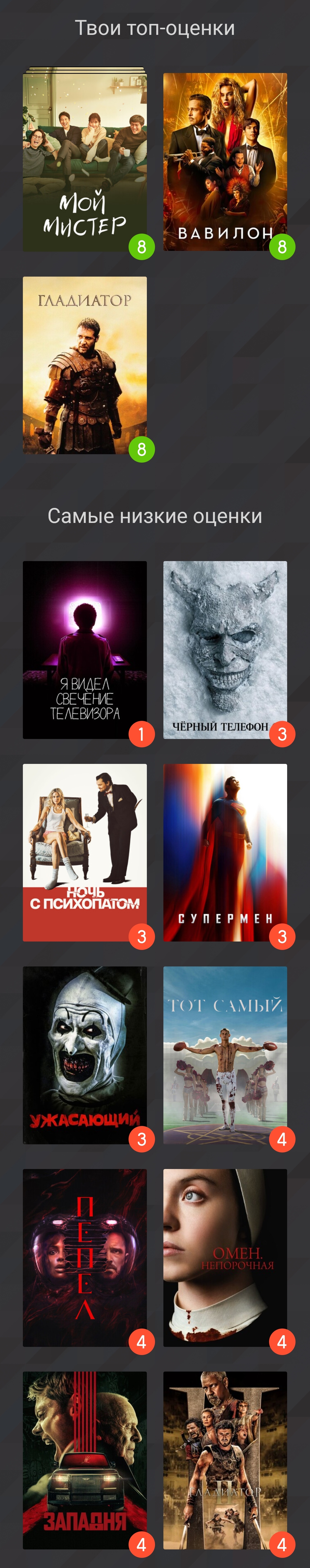 Вот топ-10 фильмов. По сериалам только Аутсорс досмотрел и это парашная чернуха. Переходный возраст, Чужой, Оно - тоже днище. Попробую ещё Одну из многих, но есть подозрение, что будет мутота.