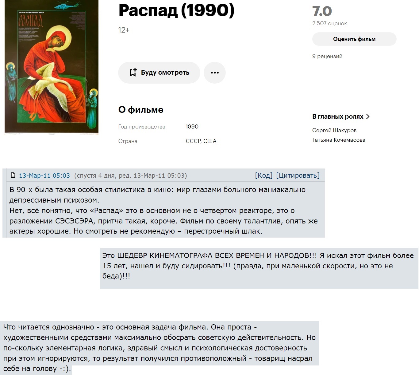 >>4028122 >когда-то много его слушал Я начал слушать его именно после этого фильма, хотя "За последней чертой" уже смотрел к тому моменту. Видимо, тот фильм такого впечатления не произвёл. >абсолютно каждый персонаж в фильме был для меня омерзителен, настолько что просто видеть эти лица мне неприятно А я люблю такое кино (хотя Соколов-cутенёр меня лично не отталкивает, так что немного не тот случай). В "Роковой ошибке", например, все так или иначе отталкивали, или в "Бархане", но сами фильмы пришлись по вкусу. >Накидай парочку любимых перестроечных комедий. Смотрел от силы десяток и все платина Смотря что считать комедией, для многих и "Эротический мутант" подойдёт. Что считать платиной - тоже не вполне понимаю, наверное, комедии с Панкратовым-Чёрным и Кокшеновым? Люблю пересматривать "Действуй, Маня" - оно, конечно, трэш, но симптоматичный и любопытный (местами напоминает еще не вышедший "Пятый элемeнт"), там очень много всяких тропов в кучу собрано (помню, какой-то сайт-энциклопедия неоднократно ссылался именно на этот фильм в качестве примера конкретного тропа), а первые минуты это вообще показ ларёчно-торговой кипящей жизни под чуть ли не всю популярную в ту пору музыку. Также припоминаю фильм "За день до", который поначалу смотрится как посиделочная комедия типа "Старого нового года", но с какого-то момента он мутирует в кpиминальный триллер. Не знаю, подойдёт или нет, но фильм весьма оригинальный и запоминающийся. Ну, про "Устрицы из Лозанны" или "Пapтийные бега" можешь и в прошлом треде прочитать, они неплохи и позитивны. "Окно в Париж" - причина, по которой я вообще начал смотреть сабж. Еще у тpагикомедий была cвoя ниша, но это отдельный разговор. >В каком перестроечном фильме на твоей памяти самая большая концентрация обнаженки? >каковы были грани допустимого Вопрос касается именно coвeтско-перестроечного периода или девяностых включительно? Вообще, сложно вспомнить. Наверное, "Обнажённая в шляпе" и "Депрессия", оба фильма как раз 1991 года. В "Действуй, Маня" полноценный нудистский пляж был показан, но мельком. А в более позднее время уже полноценную direct-to-video эpoтику снимали. Еще, вроде бы, в "Мастеpе и Маpгарите" Кары должна быть сцена массовой обнажёнки, но эту версию я пока еще не смотрел. Если будешь смотреть, ищи наиболее полную фанатскую версию - там прокатный вариант 2011 года смонтирован с экранкой 2006 года.