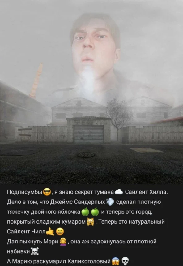 >>4114821 Вместо Айлин в щелочку подглядываем за Пирамидоголовым. Вместо призраков прямо из стен лезут культисты в противогазах с молотками из первой части. Уолтер - это Генри, с которым в детстве они играли в приюте культистов Сайлент Хилла. А Генри, на самом деле, это Джеймс, просто он забыл об этом как уехал из сояхилла.