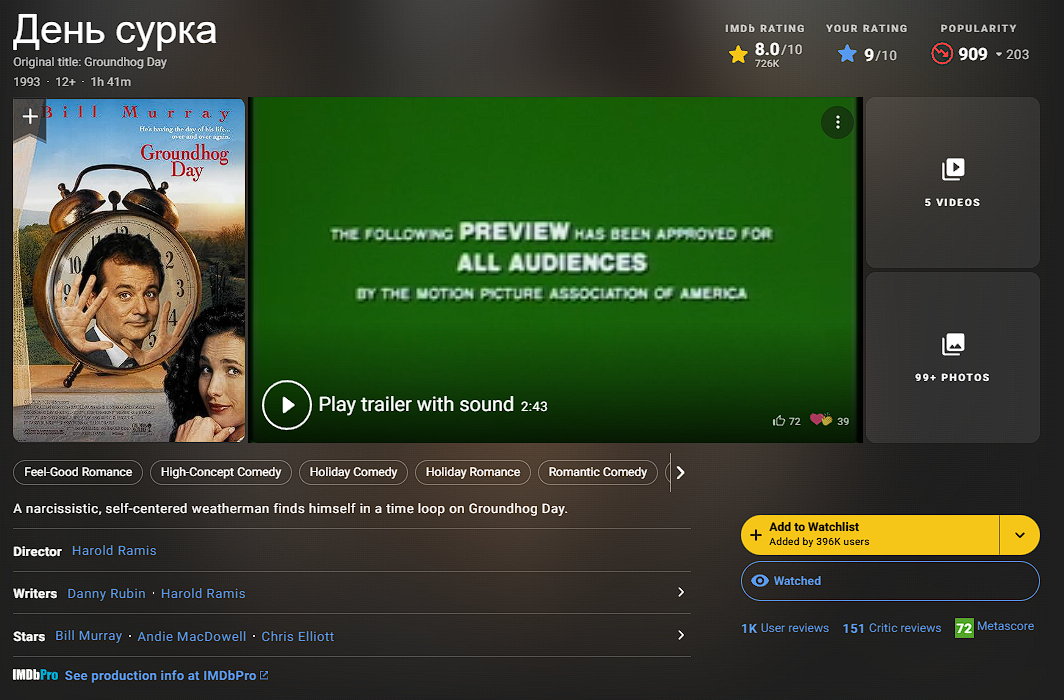 После великолепного "Бойцовского клуба", который оказался на удивление отвратителен, сел впервые смотреть... "День сурка"!!! Напутствия? У кого-то числится в списке любимых фильмов?