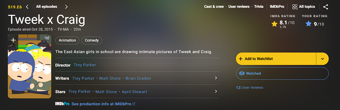 Одна из лучших серий южного парка с сильнейшим метакомментарием (вернее даже метакомментариями - их несколько). Лично мне понравился посыл с христианской жерственностью, когда в угоду общественному благополучию главные герои явили себя миру как геи, хотя геями не являются - ибо не могли смотреть на грустные лица горожан. При это не обошли создатели и вопрос глобализации, при поднятии которого намекалось, что гомосексуализм - одна из спор этой самой глобализации. 9/10