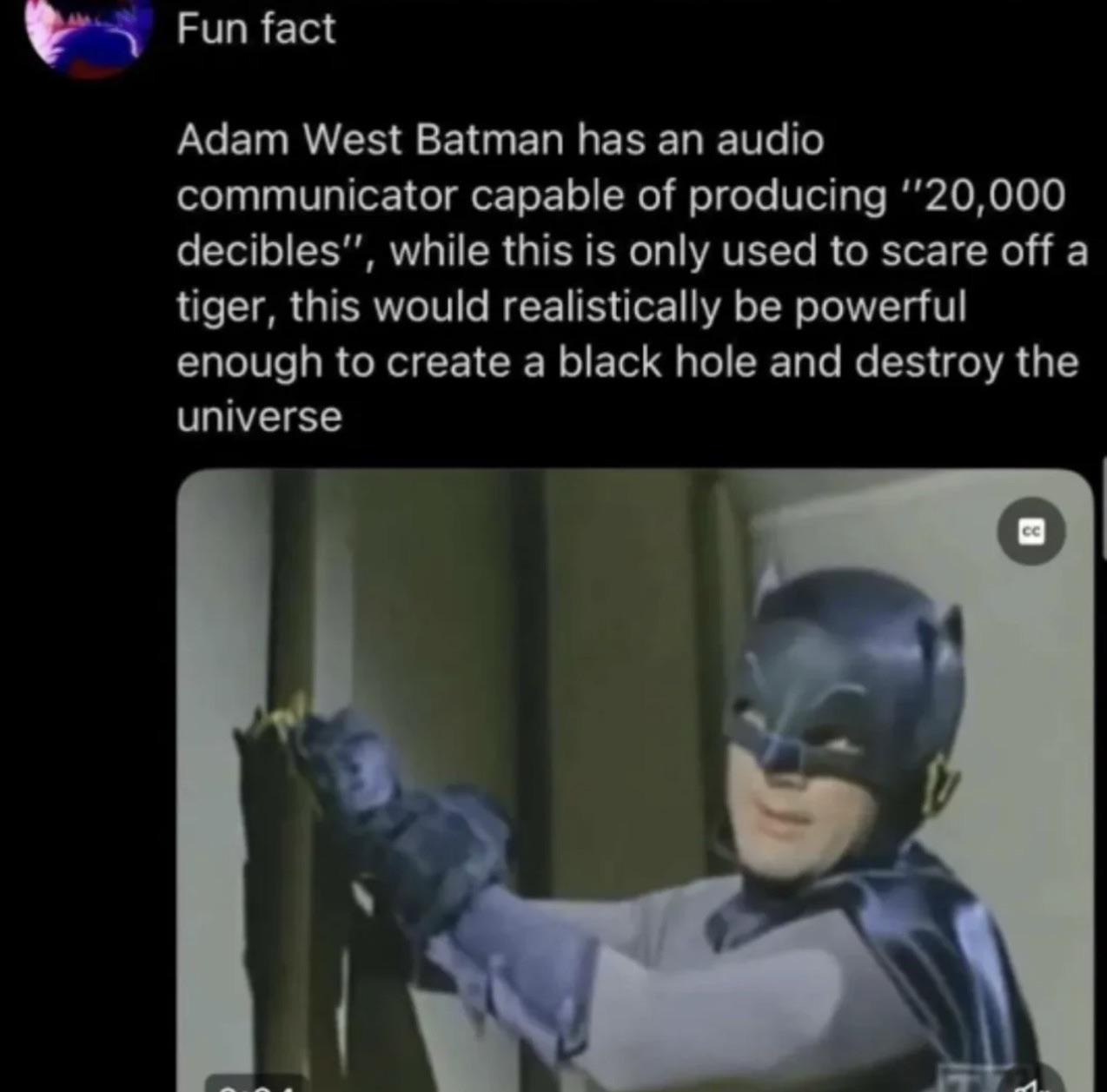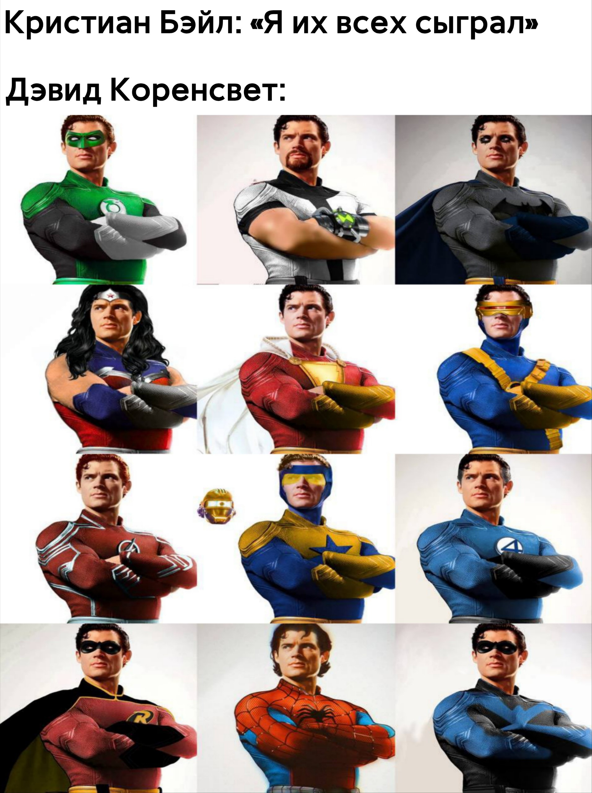 >>4042837 Было бы прикольно если бы Генри реально б стал Бэтменом и носил бы Нолановский костюм. Потом бы выяснилось (например кто-то его пытается взорвать или утопить в кислоте и в конце он оказывается либо полностью голый либо в КРАСНЫХ ТРУСАХ которые он сделал из старого плаща из ЧиС) что на самом деле это DCEU Кларк Кент и он просто притворялся что у него нет суперсил. Мгновенная отсылка на все возможные каноны. Включая теорию о 14 арках, но по-другому . Супермен = Бэтмен = Супермен Нолан = Нолан Супермен Нолана = Бэтмен Нолана = Супермен Нолана
