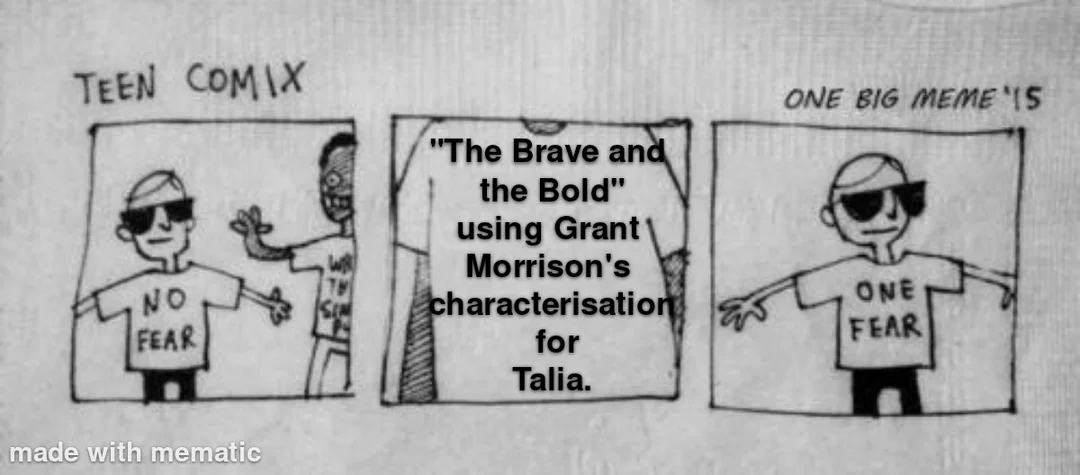 >>4052874 Талия была раньше фем фаталь с большим запасом хитрожопости, но и с кодексом чести, и искренне любила Брюса. А Моррисон сделал из неё ебанутую отмороженную суку, помешанную на евгенике.