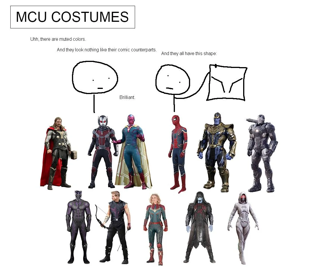 Было бы лучше, если бы они в нормисовой одежде ходили, ну максимум - добавить в нее индивидуальности для каждого персонажа. Они и так сверхлюди, нахуй отдельный маскарад из толпы выделяться? И не стыдно было бы смотреть при маме такое. Но тогда же гомиксодауны завопят НЕ КАК В ГОМИКСАХ