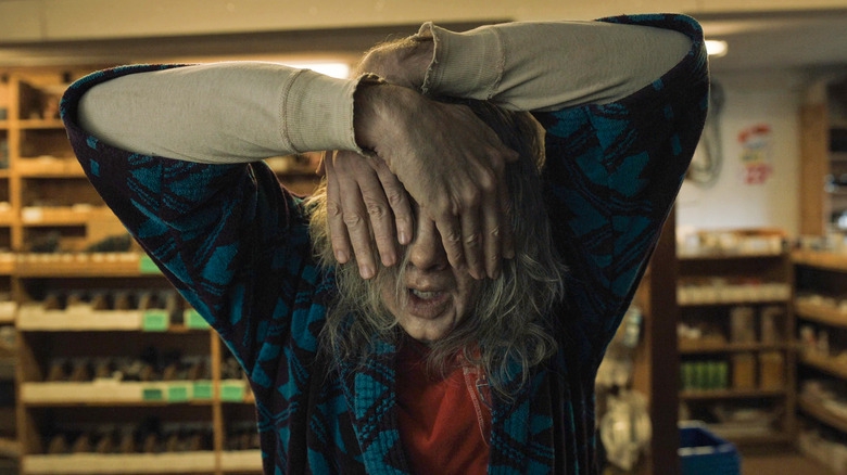 И первые полчаса сразу дают понять, что - не раз говорил, что не люблю эти слова, но HIM оборачивается самым претенциозным хоррором с приставкой "пост" из всех, что я видел. Он собирает большую часть характерных приёмов, к которым мы привыкли за это десятилетия царствования заумных страшилок, и использует их так поверхностно и бездумно, как не отважится даже самый чсвшный выпускник ВГИКа. История о токсичной маскулинности и подковёрных кошмарах большого спорта в руках Дастина Типпинга звенит пошлостью громких, намеренно кричащих диалогов Уизэрса и Уайнса; обязательные символичные галлюцинации, заговоры и таинственный лор хаотичны и абстрактны; локации, напоминающие то храм, то трофейную комнату, не похожи на реальные ни на йоту; а редкие действительно удачные решения и визуальные рифмы, вроде схожести швов на мяче и голове героя, не прогрессируют и тиражируются фильмом по несколько раз.