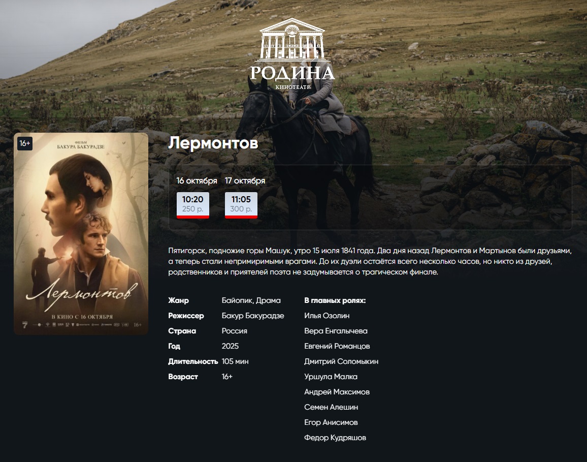 В целом понравилось. Хорошая операторская работа. Очень долгие медитативные планы (в начале пять минут смотрим на пятку за дверью под чавканье лошади). Красивые виды на плато Бермамыт. Живой и атмосферный звук, постоянно за кадром кто-то бормочет, чем-то хрустят, шумят, при почти полном отсутствии музыки. По настроению очень меланхолично все. Бакурадзе довольно жирно намекает, что дуэль - на самом деле самоубийство. Озолин на удивление хорошо показывает одиночество в толпе и невыносимость бытия Лермонтова почти без слов. Очень чеховский настрой, персонажи говорят на посторонние темы, но ты прямо чувствуешь, как все несется к неизбежному финалу.