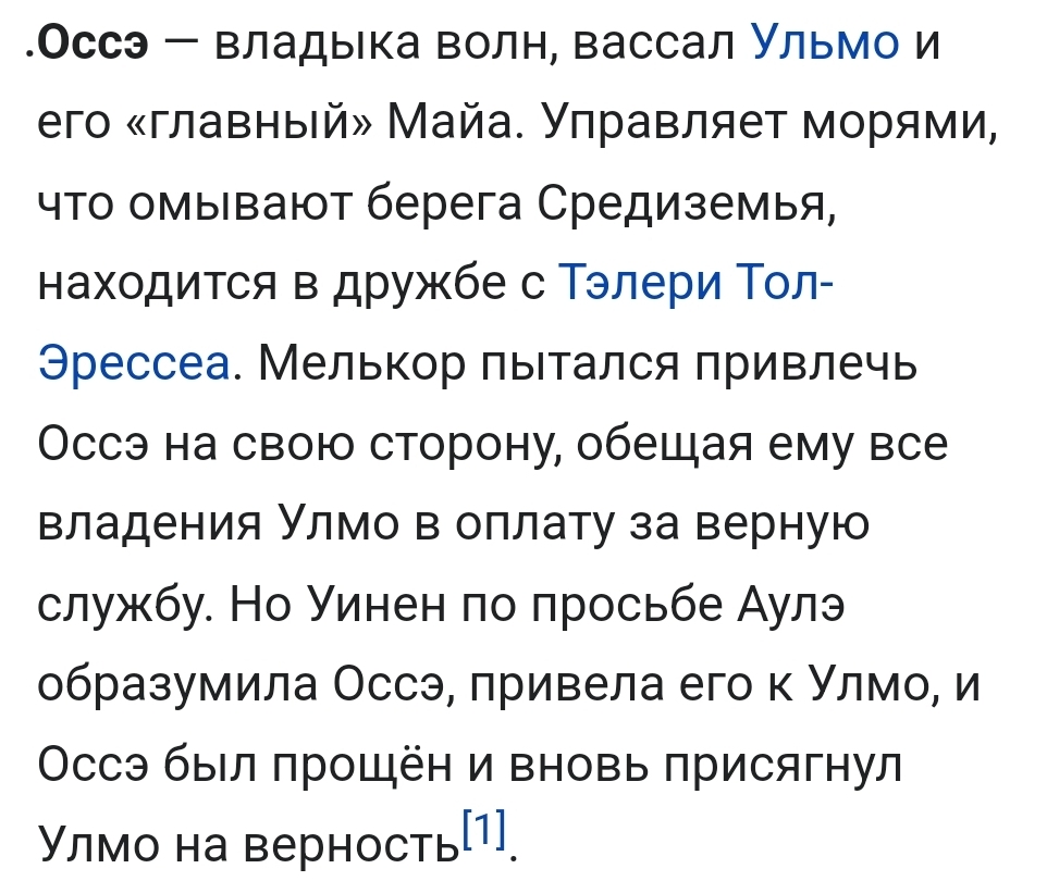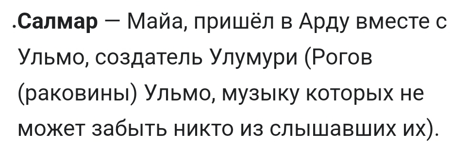 Майа Салмар создал Улумури (Рога раковины) Ульмо и пришёл в Арду вместе с Ульмо. Вассал самого Ульмо, Оссэ, друживший с Тэлери Тол-Эрессеа и совращаемый Мелькором (один из Айнур, ему противостоят Валар во главе с Манвэ; хотел взять в жёны валу Варду), был образумен Уинен (повелевает морями Арды, за исключением Эккайа) по просьбе Аулэ, снова присягнув на верность Ульмо.
