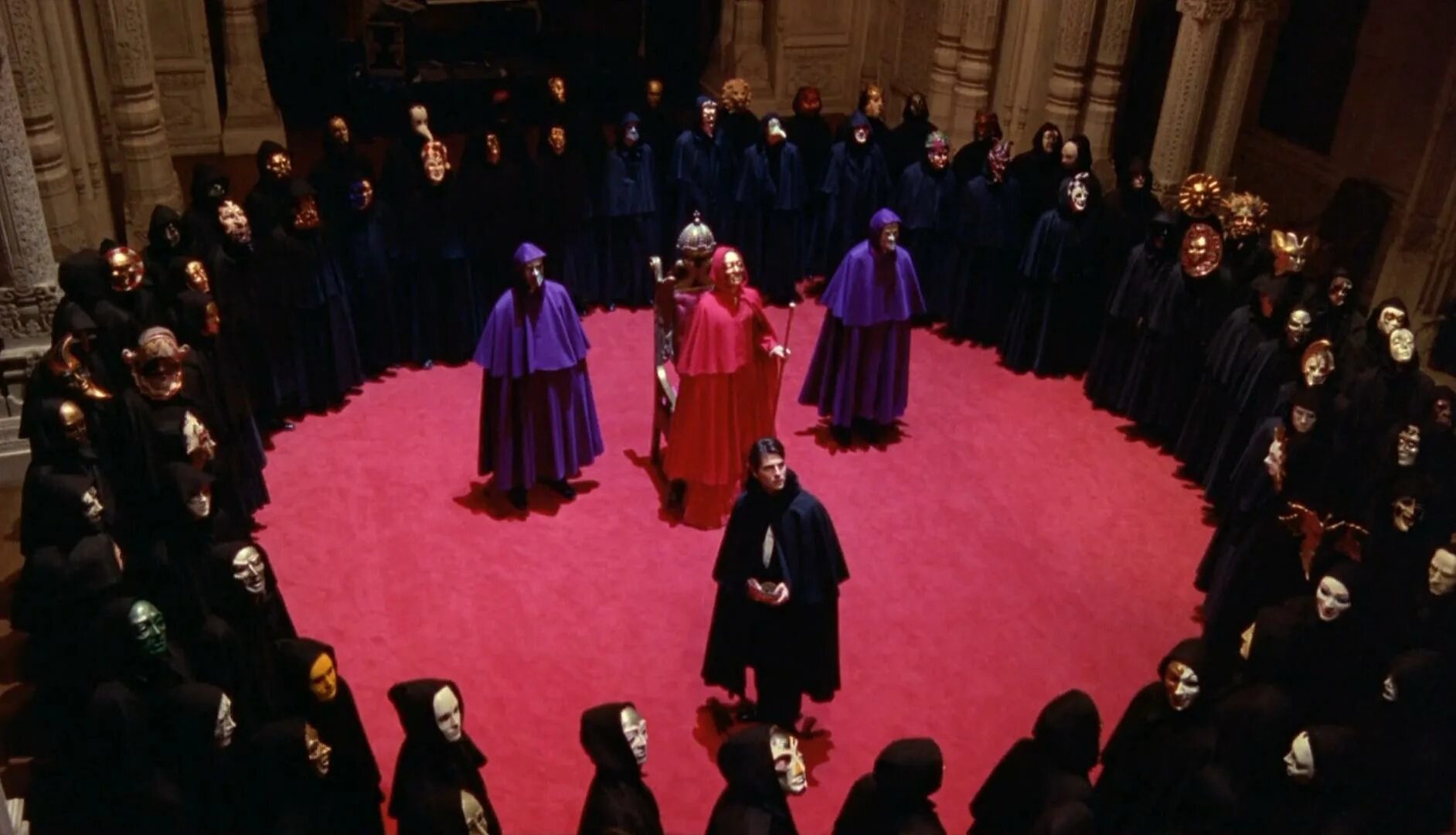 Вместо метафизической Матери — вполне конкретная дочь, вместо масонской ложи — помещение церкви. И даже обмен биологическими жидкостями происходит внутри аппарата по установлению ДНК-отцовства. Хотя прежде полковник всё же вынужден надеть перчатки и опуститься на колени перед распластавшейся на троне Ж.