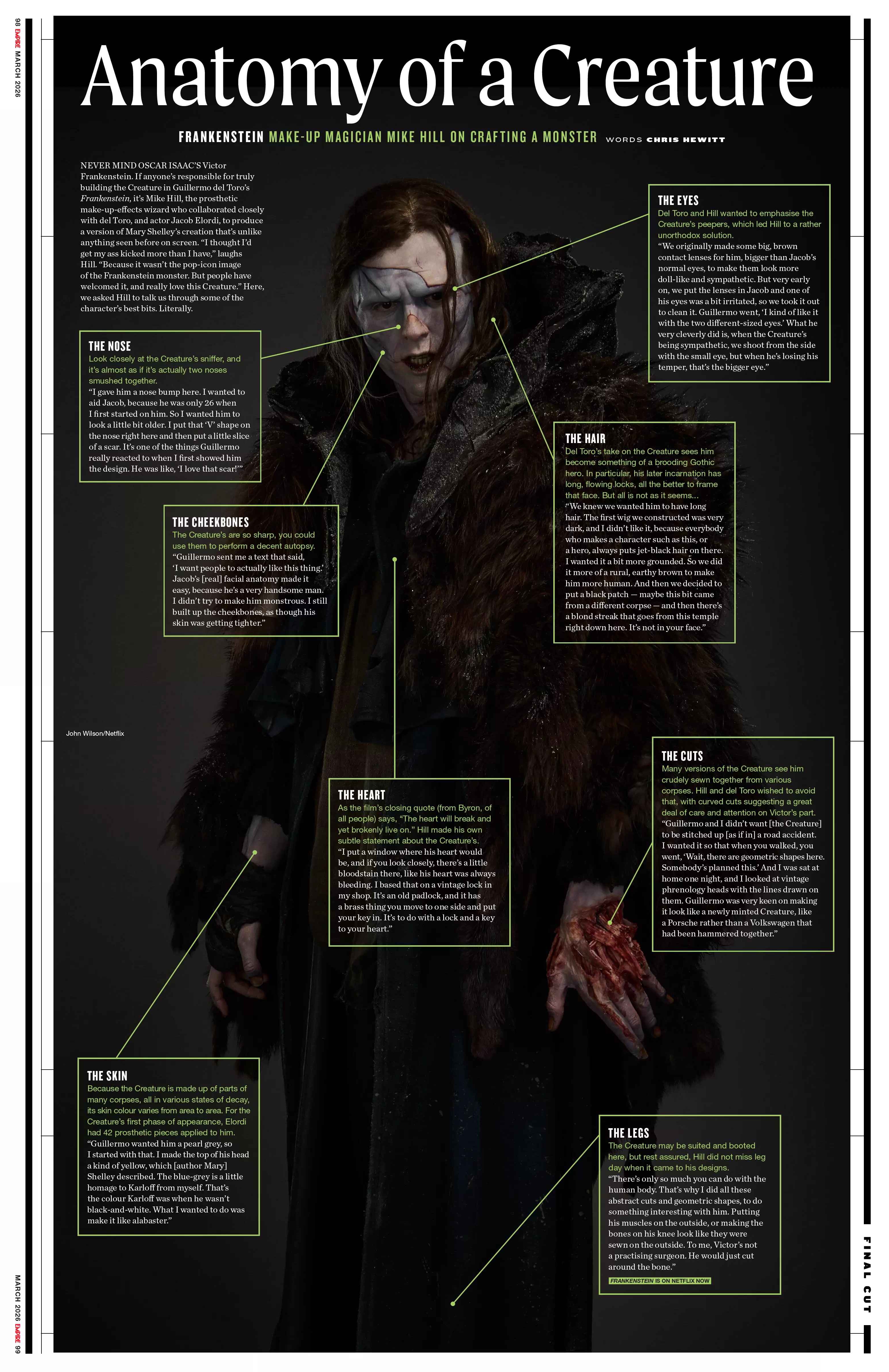 > не раз говорили, что сразу решили отойти от попкультурного образа зеленого чела со швами и болтами, потому что одна из тем фильма это отношения творца(артиста) и творения/произведения. Поэтому по задумке он выглядит как разбитая и склеенная статуя/картина Ничего из этого с итогового фильма не считывается вообще. Человек в гидрокостюме абсолютно не похож на разбитую статую. Он довольно таки целый, он развивается по ходу сюжета, становится лучше, это всё аспекты полностью противоположные разбитой статуе. А Виктор весь фильм орет на свое творение и пытается уничтожить, охуеть отношения. Хуже базиса по раскрытию темы "отношения произведения и его творца" чем Франкенштейн и представить себе невозможно. Франкенштейн это женский романчик про женскую зависть к пенису. Мери Шелли хотела себе пенис что бы им выебать труп(ну либо насадиться своей вагиной на оживший трупный пенис). Труп это единственное что женщина не может выебать никак (можно другую женщину, можно мужчину, собаку небо, даже Аллаха, но не труп — у трупа не стои́т). Поэтому Монстр у Мери Шелли в итоге просит себе невесту что бы ебать ее труп своим трупным пенисом. Писательница реализовала все свои желания внутри своего романа. Это надо было тогда Собачье Сердце снимать, а не Франкенштейна.
