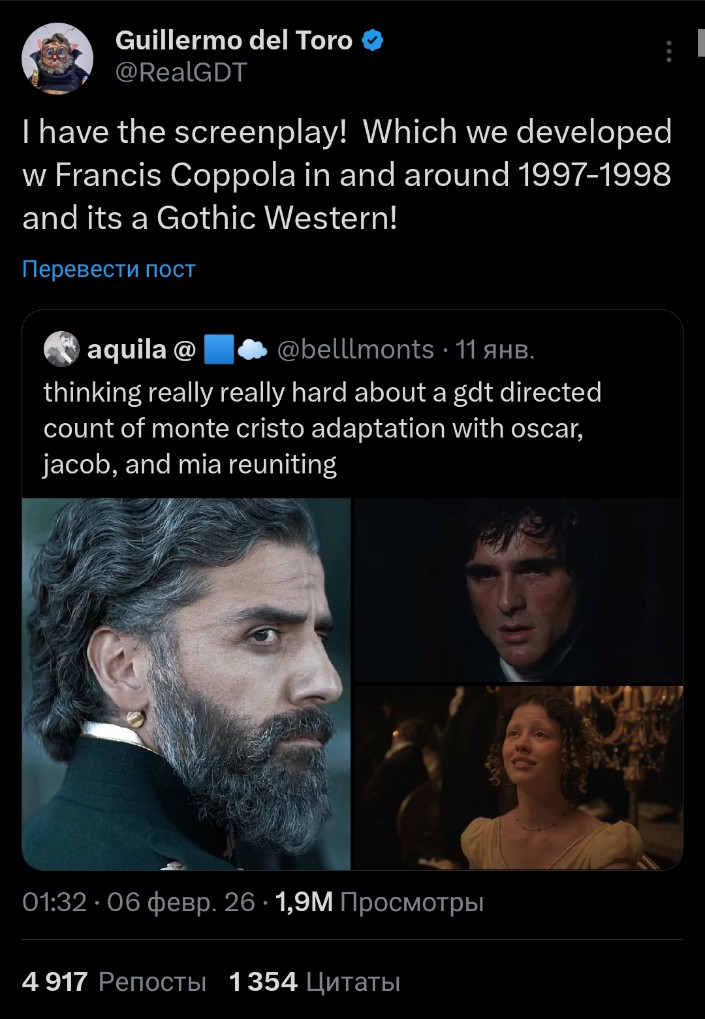 >Режиссёр Гильермо дель Торо признался, что разработал сценарий экранизации романа Александра Дюма «Граф Монте-Кристо» >Дель Торо охарактеризовал свой проект как «готический вестерн» Очередной винчик потеряли