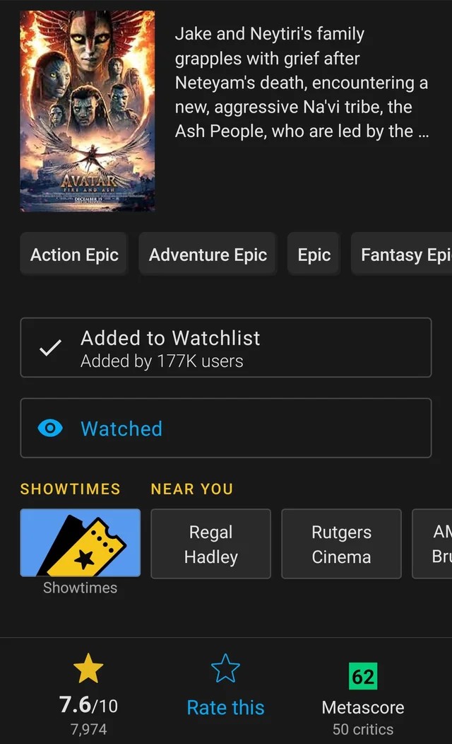 Не уверен как оценивать. Если завтра Кэмерон скажет что лавочка с четвёртым/пятым Аватаром сворачивается, я рвать волосы на голове не стану, возможно даже обрадуюсь что старина переключиться на какие-то другие проекты. Любопытство первой половины триквела медленно, но уверенно сменяло себя регулярно всплывающей мыслью что франшиза себя изжила. Боязнь к радикальным поворотам сюжета и принятию высоких ставок в сценарии, сериальную скорость развития арок персонажей, сюжетную броню по прочности конкурирующая с марвеловским вибраниумом, я заприметил еще во втором фильме, но тогда списал это на то что Кэмерон заряжает ружья которые драматически выстрелят в третьем и придадут веса всей истории в целом, на выходе существование Fire and Ash даже портит восприятие от Way of Water. Поскольку третий фильм ощущается дополненной версией второго, именно версией. И тут такой момент. Сделано то всё круто. Блокбастер люксового качетсва, шикарный экшн которого стало больше по количеству и по масштабу на тех же сет писах что и во втором фильме, плюс еще парочка новых. И есть такое ощущение что будь именно этот фильм, а не Way of Water, сиквелом первого спустя 13 лет, то вышел бы я куда в большем восторге чем в своё время выходил из Way of Water. Но это разговоры ни о чем, по факту же из-за ощущения насколько всё это уже знакомо трьошку досматривал поглядывая на время в телефоне. Знакомо кстати до комичного, моментами в некоторых сценах я думал что мне показывают флешбеки второго фильма. 6/10