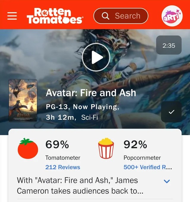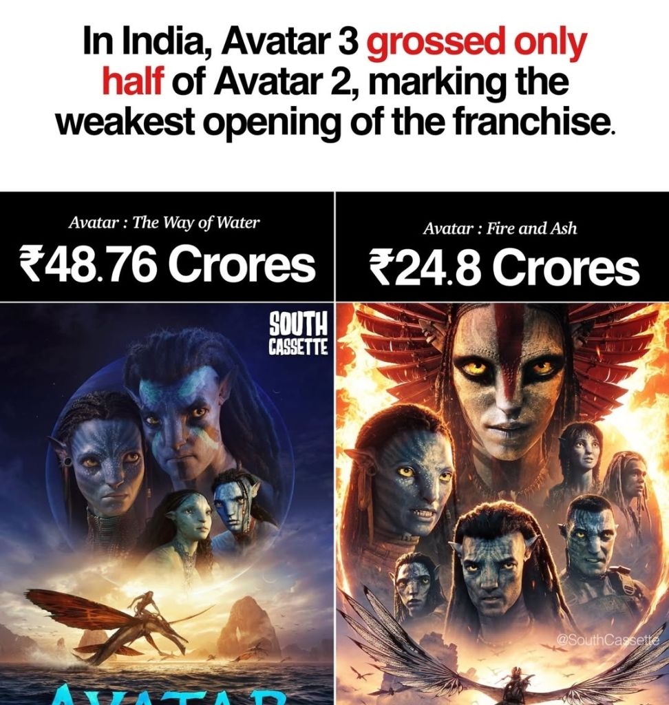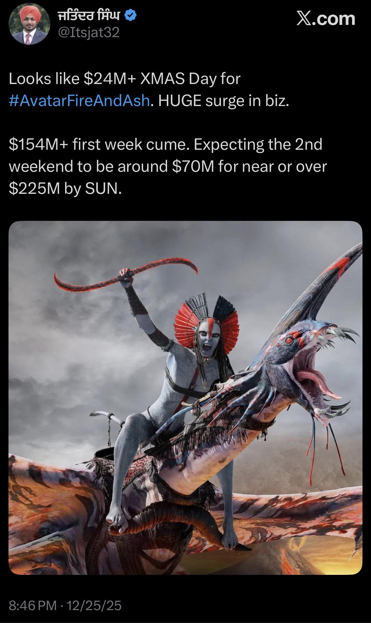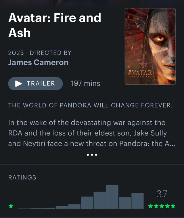 Фильм «Аватар: Огонь и пепел» собрал 340-350 миллионов долларов в мировом прокате в первый уик-энд – международный кассовый сбор. На 100 миллионов меньше чем прошлый, но все еще отличный результат. Оценки зрителей высокие.