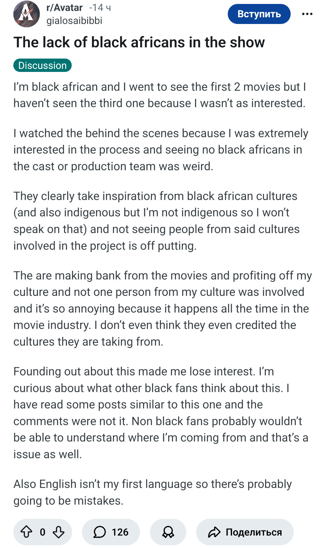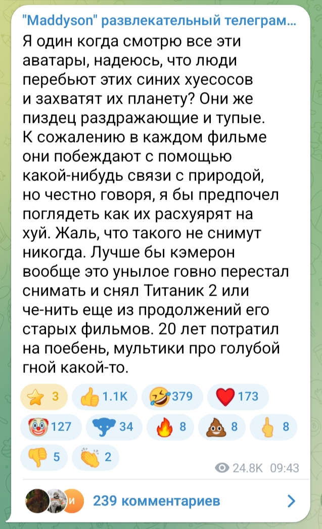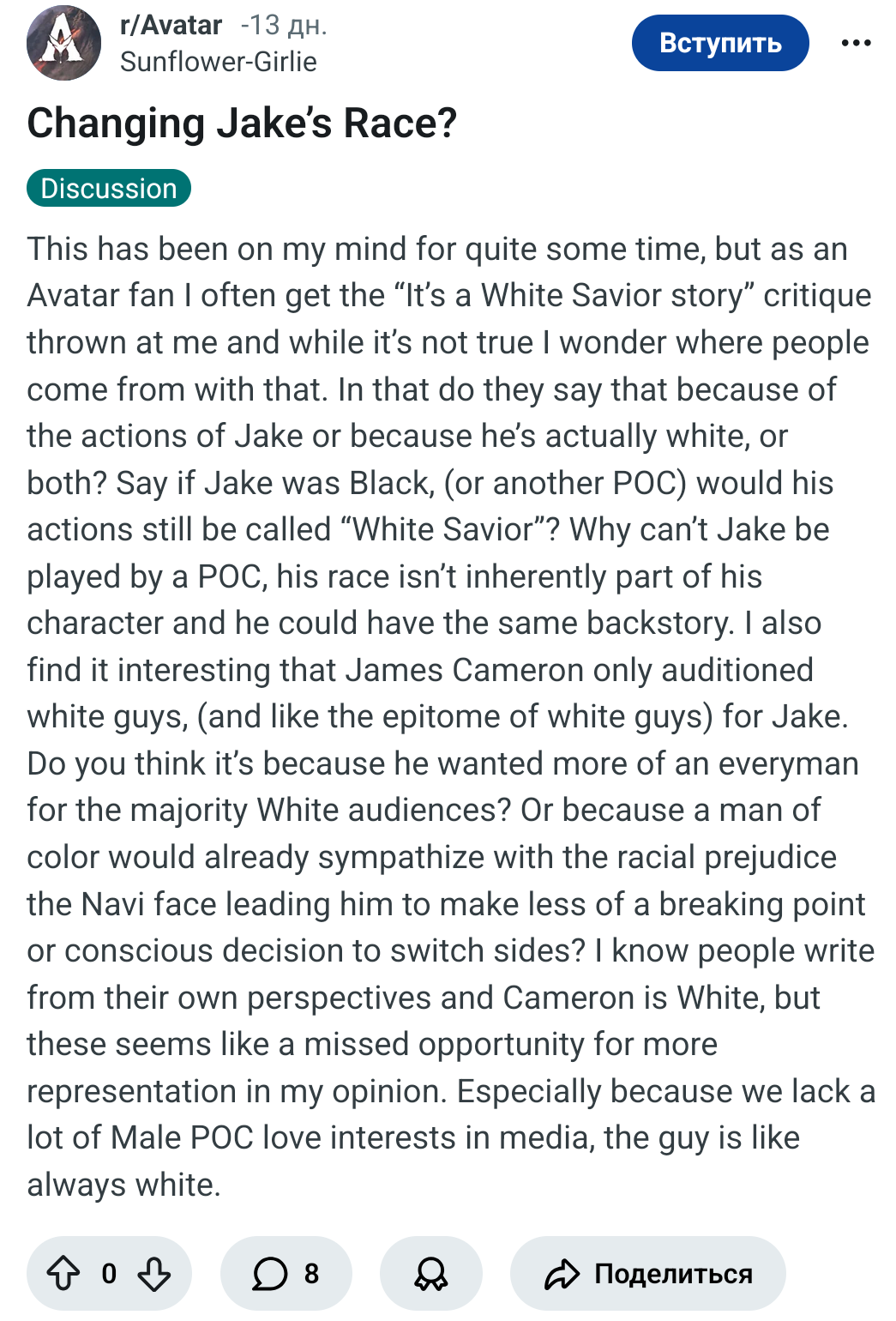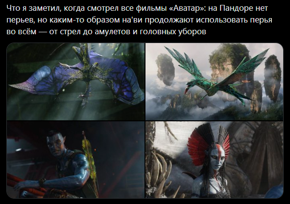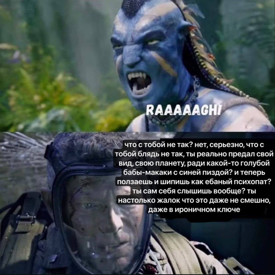 Первый Аватар тоже хуйня понатасканная ото всюду где только можно. Помню у меня кореш был в окологолливудской тусовке, работал там "принеси-подай" на съемках разных фильмов в 2008-2012. Так вот, во времена съемок и выхода первого Аватара в прокат, многие в кулуарах стебались, что Камерон смотрел Федину 9 роту и она ему так понравилась, что он почти под чистую спиздил вдохновился и снял очень похожую сцену брифинга Квортича в Аватаре, аля Серебряков перед новобранцами в 9 роте. Можете сами глянуть и сравнить. Да и камероновский Квартич первой части это тип смесь персонажей Серебрякова и Пореченкова. Сцены реально очень сильно похожи визуально и по смыслу.