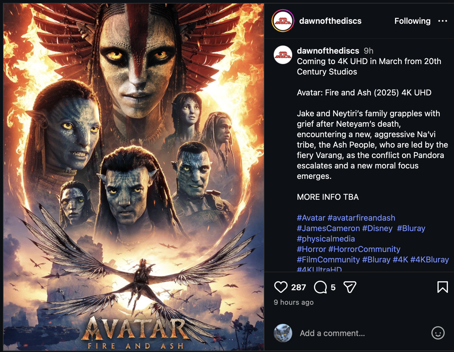 Премьера фильма «Аватар: Пламя и пепел» состоялась 19 декабря 2025 года. В России картина выйдет позже из-за отказа кинотеатров от показа зарубежных новинок в новогодний период. В третьей части серии рассказывается о «более темной стороне народа на'ви», в частности об огненном племени.