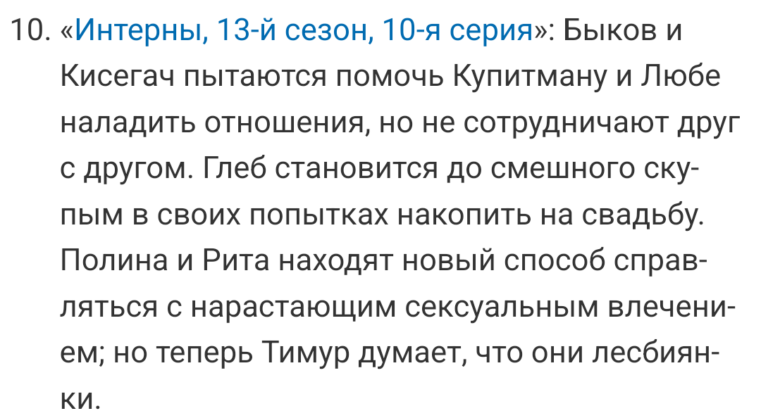 Капец, Хрустальный на 11 месте. Да он весь топ-10 ебёт. Ну хорошо хоть в топе Почка есть, 13-я клиническая (но нет Караморы и Бара Один звонок), Подслушано в Рыбинске. А вот Кибердеревня очень слабая, чтобы в топе быть. Ласт квест - шикарный визуал, но сам сериал такой лютый пиздец, лучше Капельника или Офлайн посмотреть. Король и Шут слабый сериал, взлетел чисто из-за любви к группе, в некоторых моментах актёры очень неубедительно играют, надо было больше дублей делать. Топи - днище, уж лучше первый сезон Территории посмотреть, второго не существует.
