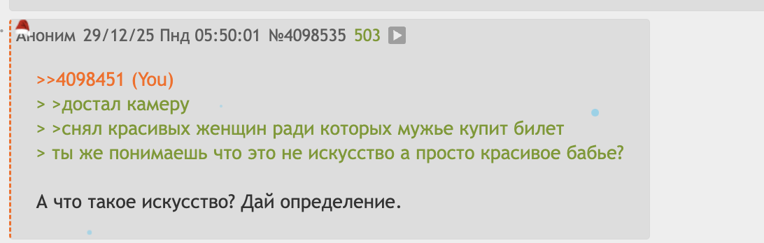 >>4098559 >>4098652 >>4098657 Искусство – это всё, что создано Человеком Разумным. Вообще всё, начиная с каменных орудий труда и заканчивая постом в интернете. Выточить каменный наконечник – самое настоящее искусство. И так во всём, что создано человеком. Любая вешалка или табуретка, созданная вами в школе на уроках труда – это искусство. И этот мой пост – искусство. Каждый мой пост – искусство. И не мой тоже. Искусство может нравиться или не нравиться. Не отношение делает искусство искусством, а искусственость его создания человеком. Вот естественным образом выросшее дерево или текцщая река искусством не являются, как бы прекрасны они не были. Разве что если рассматривать всю нашу вселенную как акт творения божественного искусства. Но я говорю о человеческом искусстве.