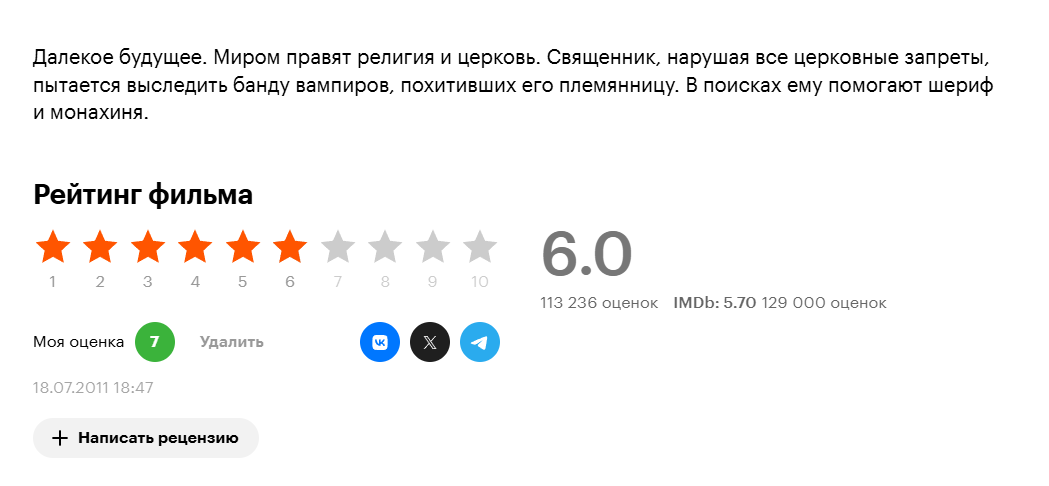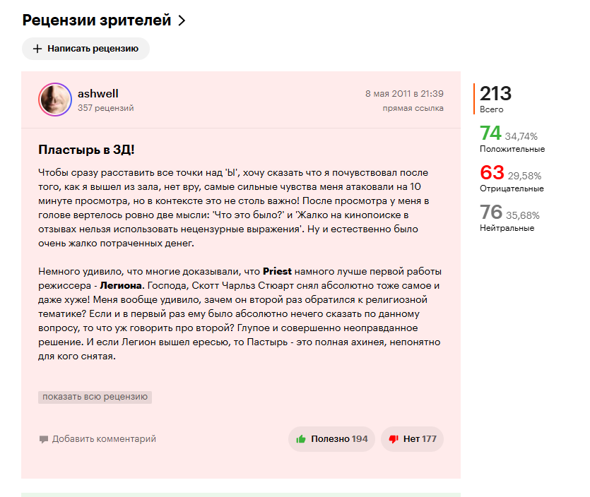ПАСТЫРЬ (2011) Вот ХЗ, почему то иногда пересатриваю этот фильм, хотя отзывы у него каловые. как написал один рецензент ПАСТЫРЬ-КОПИПАСТЫРЬ, ПЛАСТЫРЬ В 3Д Фильм реально охуенно страдает от кучи болячек. Сперва - что пиздатого. Пиздатая атмосфера. такой стимпанк с примесью сити 17, эквилибриума и всяких оруэллов. Еще и вампиры. Но остальное начинает буквально срать в лицо. Диалоги в фильме ультра пафосные. Сам сеттинг видно что взят с пизданутого комикса где пастыри с крестами на лицах в виде татух, какое то ебанутое оружие и прочее. Экшона мало и он так себе. Короче кроме атмосферы нихуя, только дебильные диалоги и вялый экшон. Фильм еще и очень короткий. вначале тупо комикс - бюджета нету, хавайте. И самое сливное это финальная драка, где очевидно супер крутого противника в лице карла урбана сливают тупо СЛУЧАЙНО. То есть он бы при желании там всех их уработал одной левой, но его слили просто взорвав поезд. ну и нихуя не раскрыто, видно что фильм задумывался минимум в 2-х частях, но вторую часть отменили нахуй, в результате имеем непонятное нечто. По сути это хуже призрачного гонщика. но чуть лучше второй части гонщика.