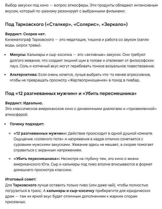 было что то типа "пиво с кальмарами и сыром косичкой лучше идёт под фильмы тарковского или под "убить пересмешника" и "12 разгневанных мужчин" ? в google gemini