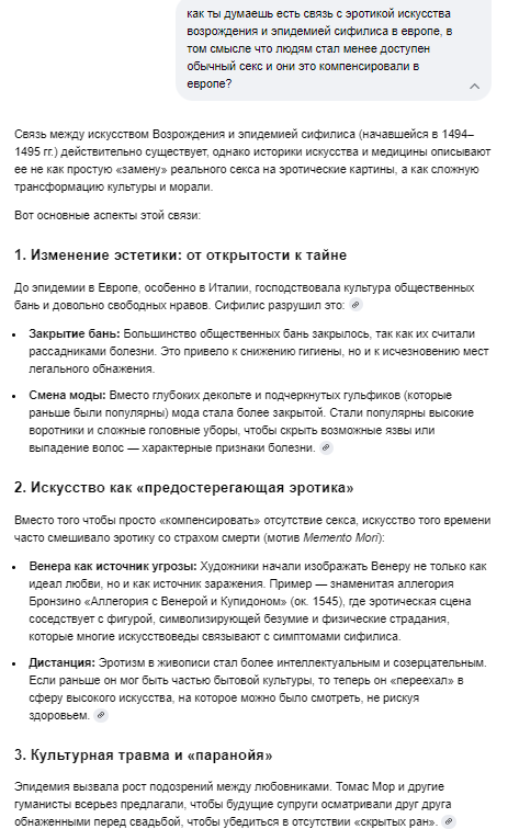 >>4098543 Успех живописи Ренессанса во многом состоялся из-за того, что это именно что "порно", которое богатеи стали заказывать художникам и вешать в своих дворцах. Библейские сюжеты превратили в порнографический комикс, гениальный порнографический комикс. Это искусство не только в качестве искусных умений рисовальщиков, но и в качестве эпатажного высказывания, могильного камня европейскому средневековью.