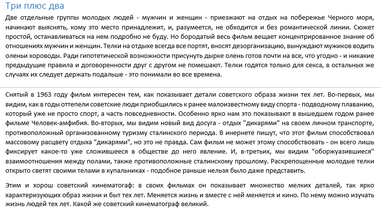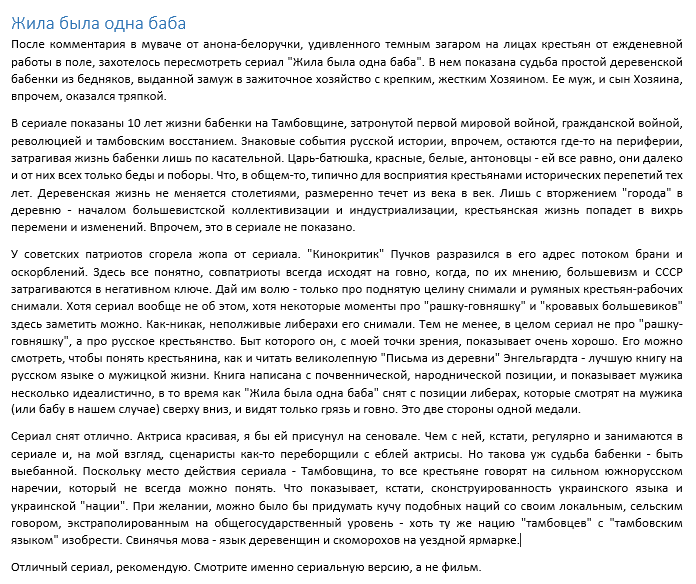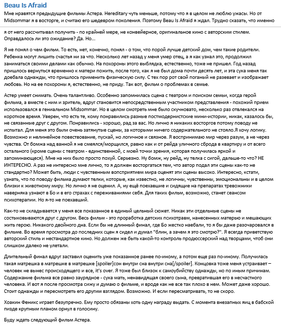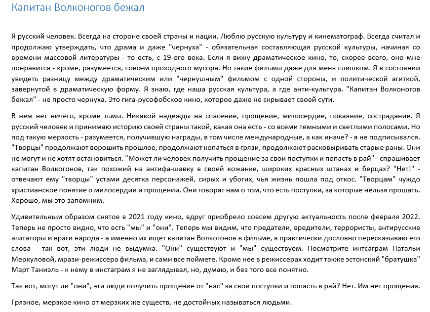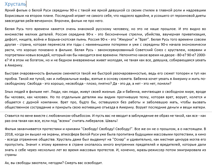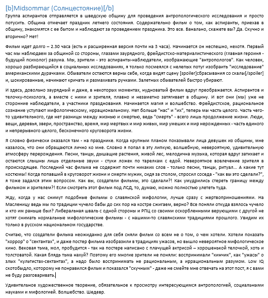 А рецензон действительно ни о чём. Я не понимаю после прочтения, хороший ли это фильм, какие у фильма есть позитивные стороны, какие - отрицательные. Постер напердел вторичными образами, упаковал в текст и думает, что цели своей достиг. Ну, своей цели он, может, и достиг, но ценность у такой рецензии для меня - нуль. Даже больше, ценности в этом посте как в тексте - нуль, ибо мысль/тема (если она была) не раскрыта, а образы, как я уже упоминал, вторичны и для меня скучны.