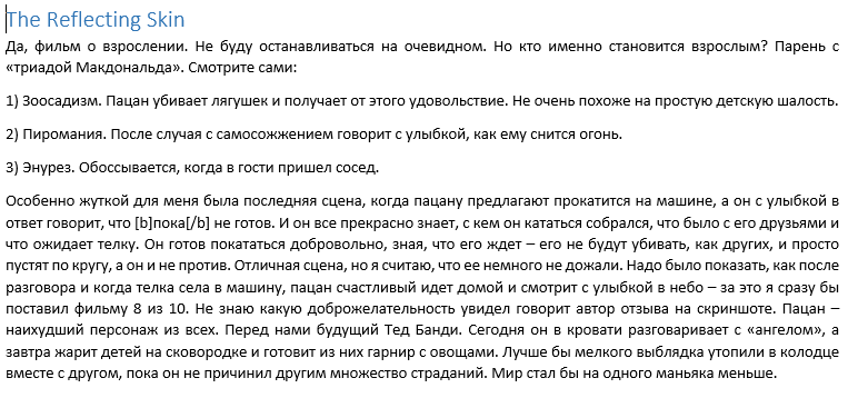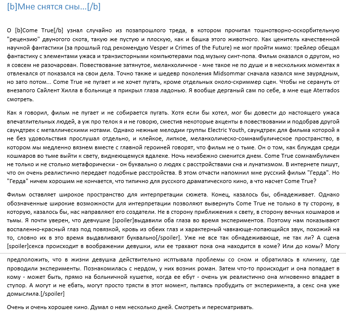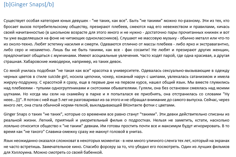 Возвращаясь к теме дубляжа, скотобыдло, например, не поймет многих деталей фильма Ginger Snaps, рецензия на который на втором скриншоте. Но такие нюансы быдлу бестолку объяснять. Как оно жрало свои дублированные помои, так и продолжит жрать.