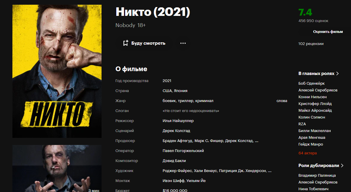 НИКТО 1 (2021) оценки фильма ОЧЕНЬ ПЕРЕХАЙПЛЕННЫЕ (пик1) По факту фильм это лютая пустышка. Этакий клипец. В чём же проблемы фильма? Всё просто: 1 - фильм является тупо цитатником прошлых боевиков. Тут спизжено с джона уика, великого уравнителя и ДАЖЕ СУКА С РЕМБО 5. вболее мелких моментах попиздили с "быстрее пули" и т.п. 2- злодеи фильма это хуйня, тупо спизжено с уика, злые русские, даже бернхарт на месте. 3 -ГГ какой то невнятный хуй, ебаный социопат. 4 - семья в фильме просто для прикола, они не играют никакой роли. 5 -конечно же ГГ помогают родственники в виде обевого деда и чернокожего "брата" (спизжено из боевичков типа "рэд) Просто жвачка без души и стиля. Из плюсов это пара удачных шуток. На этом как бы всё. Если сравнивать то любой соперник лучше - рэд, рембо 5, джон уик, великий уравнитель - все эти фильмы лучше чем "никто" и имеют более цельные и комплексные сюжеты. Тут сюжет простой - чел ебанулся и пришлось убить всех.