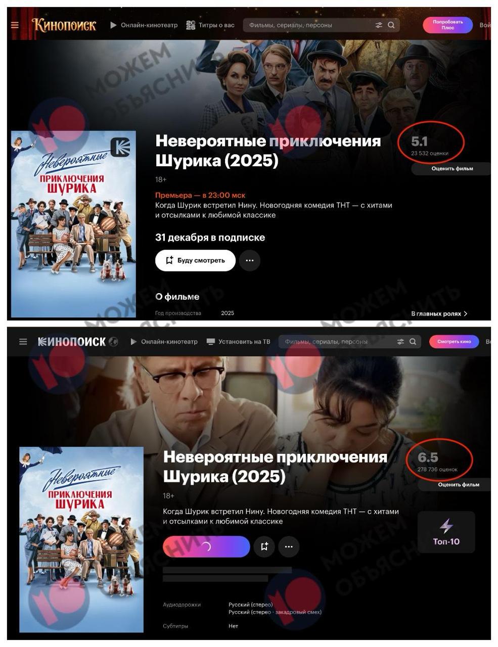 ◾️1 января 2026-го рейтинг «Невероятных приключений Шурика» составлял 5,1, что вплотную приближало его к «мусорным фильмам» (ниже 5,0). Об этом говорится в данных кэша «Яндекса», сохраненных «МО». На тот момент комедию оценили лишь 23 тыс. пользователей. Но примерно с 3 января число оценщиков резко выросло — при том, что фильм вышел в прокате еще 11 декабря 2025-го. За 4 дня число оценок увеличилось до 278 тыс. — это говорит о явной накрутке рейтинга.