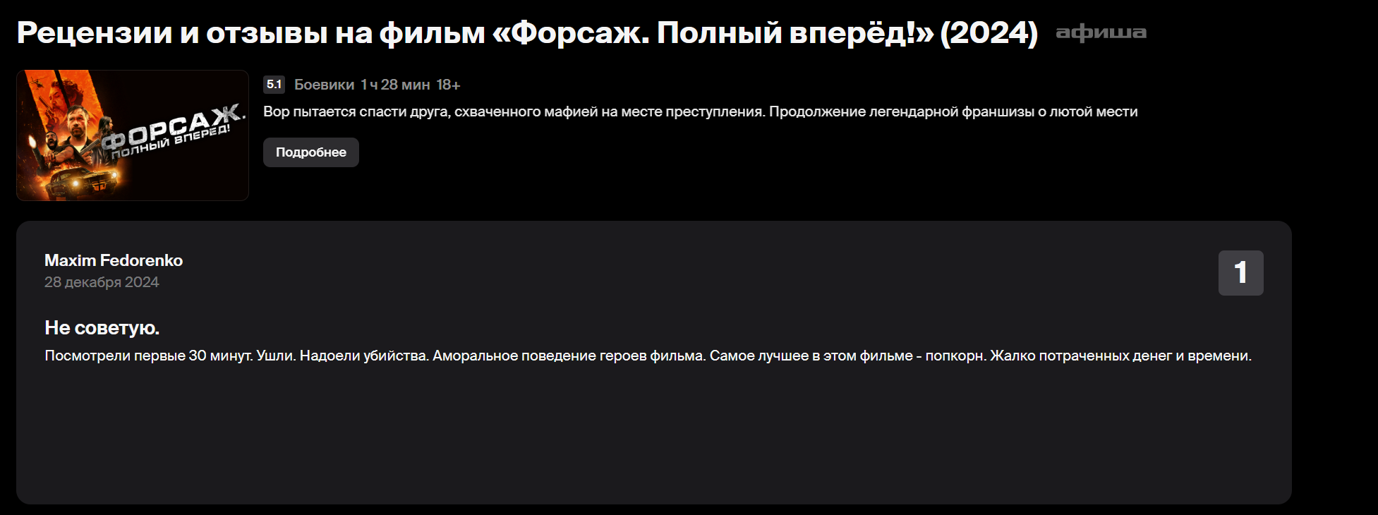 ФОРСАЖ: ПОЛНЫЙ ВПЕРЁД / ГЕТ ФАСТ (2024) Вы только посмотрите на постер! нас снова побаловали новой частью форсажа! Но где же торетто? А его нет, вместо него какой то бюджетный райан гослинг. И видимо чтобы было сложнее отличить его от реального гослинга у ГГ ебало весь фильм наполовину измазано в крови. И что самое забавное - в списке актеров имя актёра ГГ даже не вверху списка. как обычно делают. видать настолько он ноунейм. Он кстати еще и режиссер фильма. А актер - его бадди по фильму вообще без фото и его фото нельзя даже нагуглить. по ходу его вообще с улицы взяли. Что касательно фильма: Ну вы уже поняли что с форсажем наебалово, тут нет никакого форсажа и близко. Поначалу кажется что задумка пиздатая - что то в стиле гая ричи с черным юмором. да и экшон ок, кроме ОМЕРЗИТЕЛЬНОЙ ГРАФИКИ, с помощью которой сделаны все выстрелы в фильме. графика просто позорище именно в плане выстрелов и попаданий, в сценах с погонями сделано приемлемо, взрывы тоже более менее. Но после половины фильм резко сдувается и нам начинают показывать кучу диалогов, че то не очень пиздато после экшоновой половины срать диалогами. ну и концовка супер сумбурная. видно что хотели сделать типа хитровыебанно, но смотрится как пародия. То ли опыта не хватило режиссеру и главному актеру, то ли бабок было супер мало и не смогли придумать ничего поинтереснее.. началом завлекли а потом ПУК. типа там представили разных забавных злодеев, а в конце их всех просто расстреляли из пистиков. Драк кстати в фильме вообще нет, видать актер этот КЛЕЙТОН не умеет драться в принципе. ну пойдет если смотреть бухим. если трезвым то только первая половина смотрибельна.