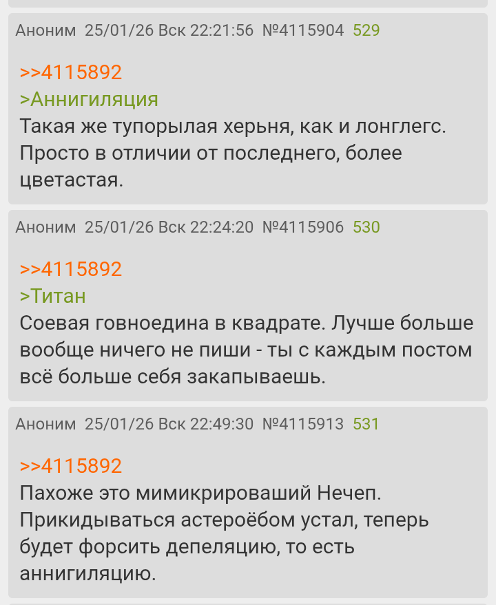 Закапываю я только твою тухлую мать. И аннигиляция и титан априори лучше 99% того, что вы тут жрёте. Второй дебил не лучше, который как собака Павлова повторяет про свой лонглегс