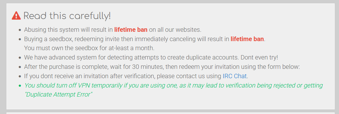 Но вообще, если я правильно понимаю, как у них работает эта партнерка с сидбоксом - им поебать, насколько часто ты используешь сидбокс и используешь ли вообще. Провайдер сидбокса сообщает трекеру (по договоренности), что чел купил сидбокс, вот пруфы. Трекер высылает тебе инвайт. Грозные слова про отмену - это про то, что хитрожопые люди могут купить сидбокс, получить инвайт, а потом рефанднуть сидбокс (отменить покупку) - типа, получить инвайт нахаляву.