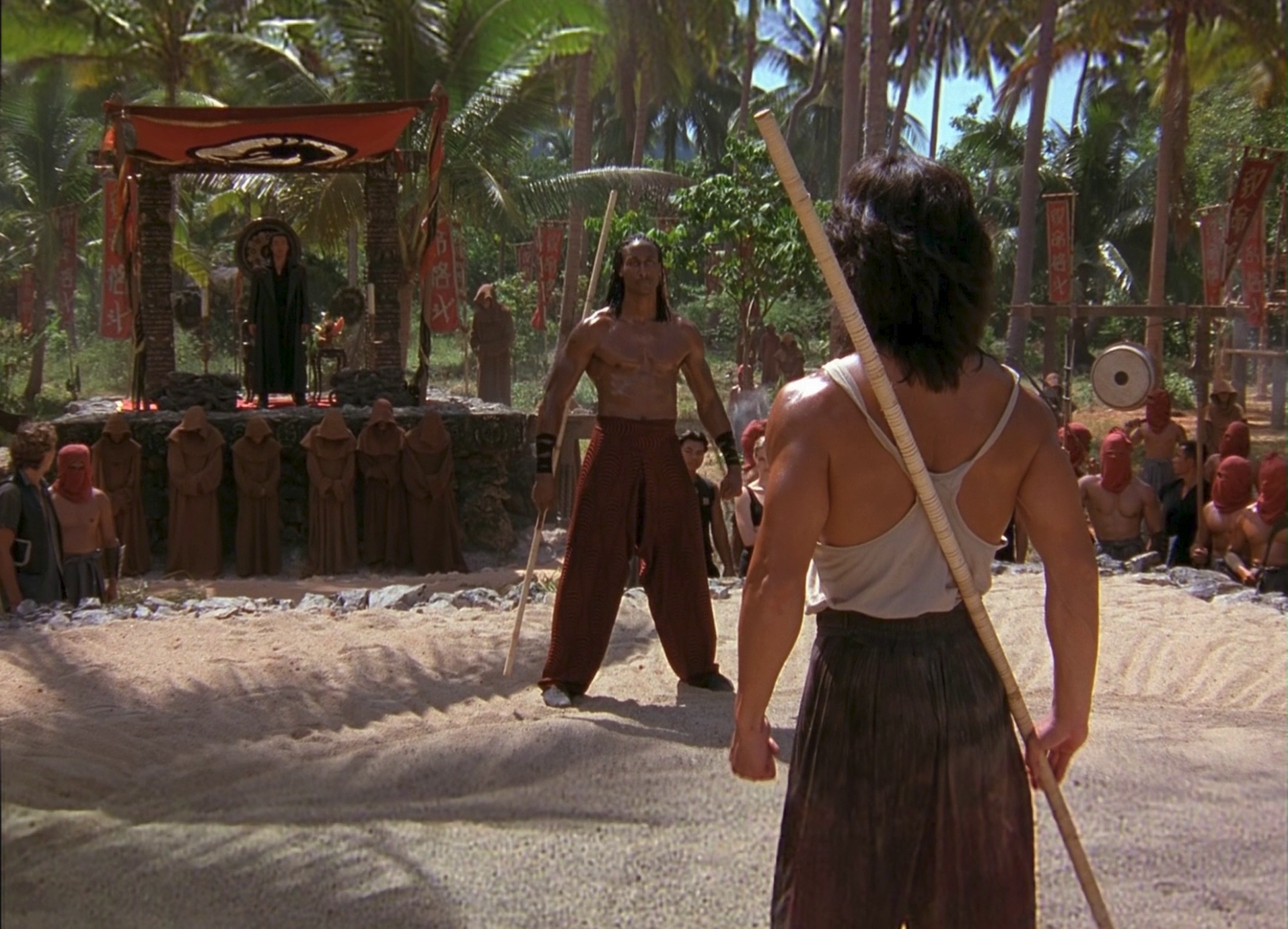 Like a lot of older movies, many of the digital effects and matte painting shots were not completed with the full open matte. In these cases, I've opted to use the widescreen 1080p source since it looks much nicer and in most cases the jump in ratio works fine for this kind of martial arts movie.