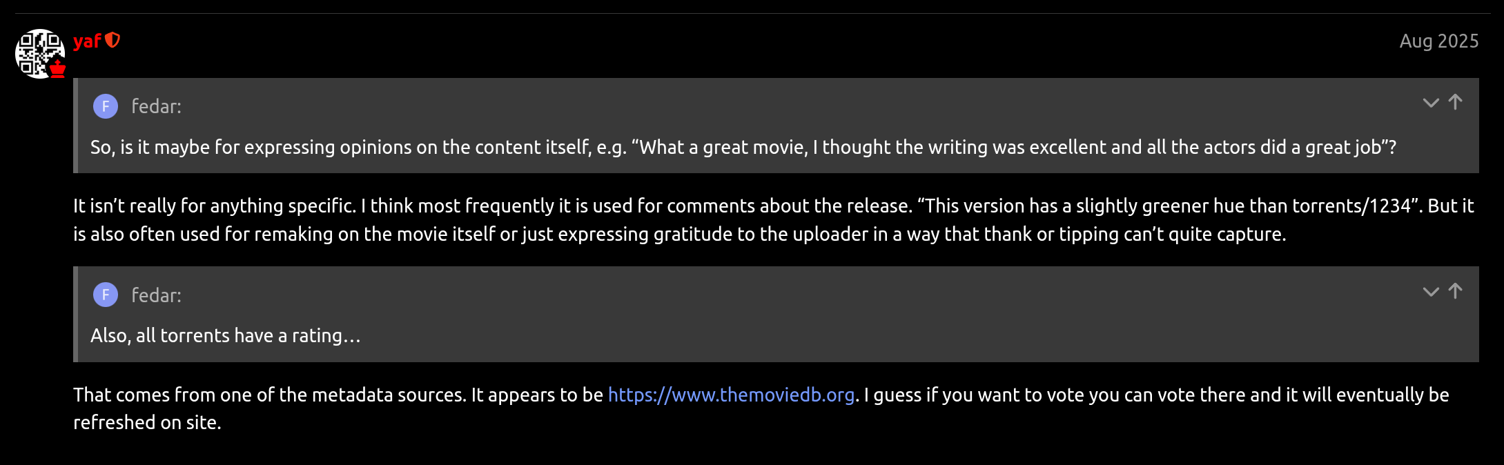 >>4121384 Если речь о сохранении фильмов для себя локально / для сидирования другим / на черный день и т.д., я бы все-таки не списывал со счетов публичные торренты, особенно Рутрекер. Потому что раздачи Рутрекера сидируются лучше любых других публичных торрентов во всем мире (не преувеличение), и если ты хочешь быть архивариусом фильма, то помогать поддерживать жизнь публичной раздаче рипа или ремукса или вебдл на Рутрекере - результативнее и разумнее, чем раздаче точно такого же рипа или ремукса или вебдл на приватном трекере. Вот если на приватном трекере лежит что-то, чего нет в публичном доступе или в лучшем качестве, чем на публике - тогда да.