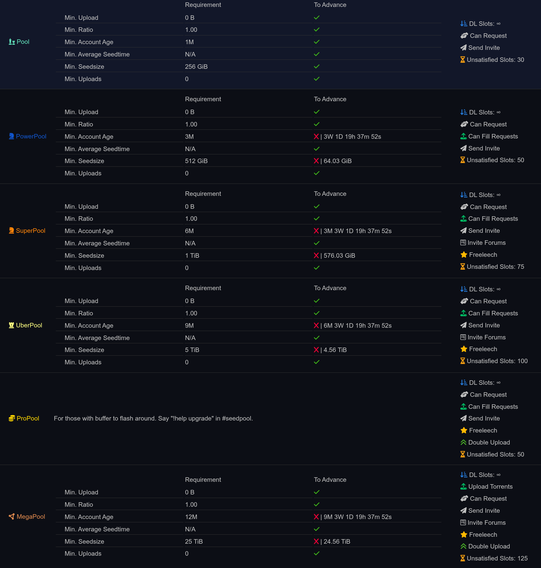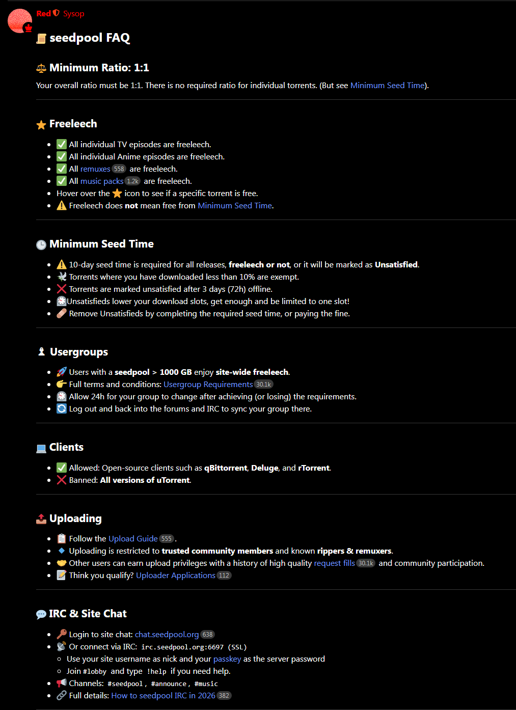 Особенности: • Живое сообщество (форум + чат) • Интерактив с получением очков аплоуда • Ежедневные раздачи на daily.seedpool.org • После аплоуда 1 TB – фрилич на все раздачи • Раздачи без архивов • Внутренние релиз-группы со специализацией на 4К-ремуксах • Поддержка Autobrr + Prowlarr, API, RSS, реквестов, IRC-ботов