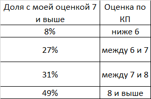 У меня, например, вполне комформистский тренд по оценочкам и чем в среднем выше оценочка по КП, тем вероятнее я поставлю высокую (7 и выше) оценку фильму.