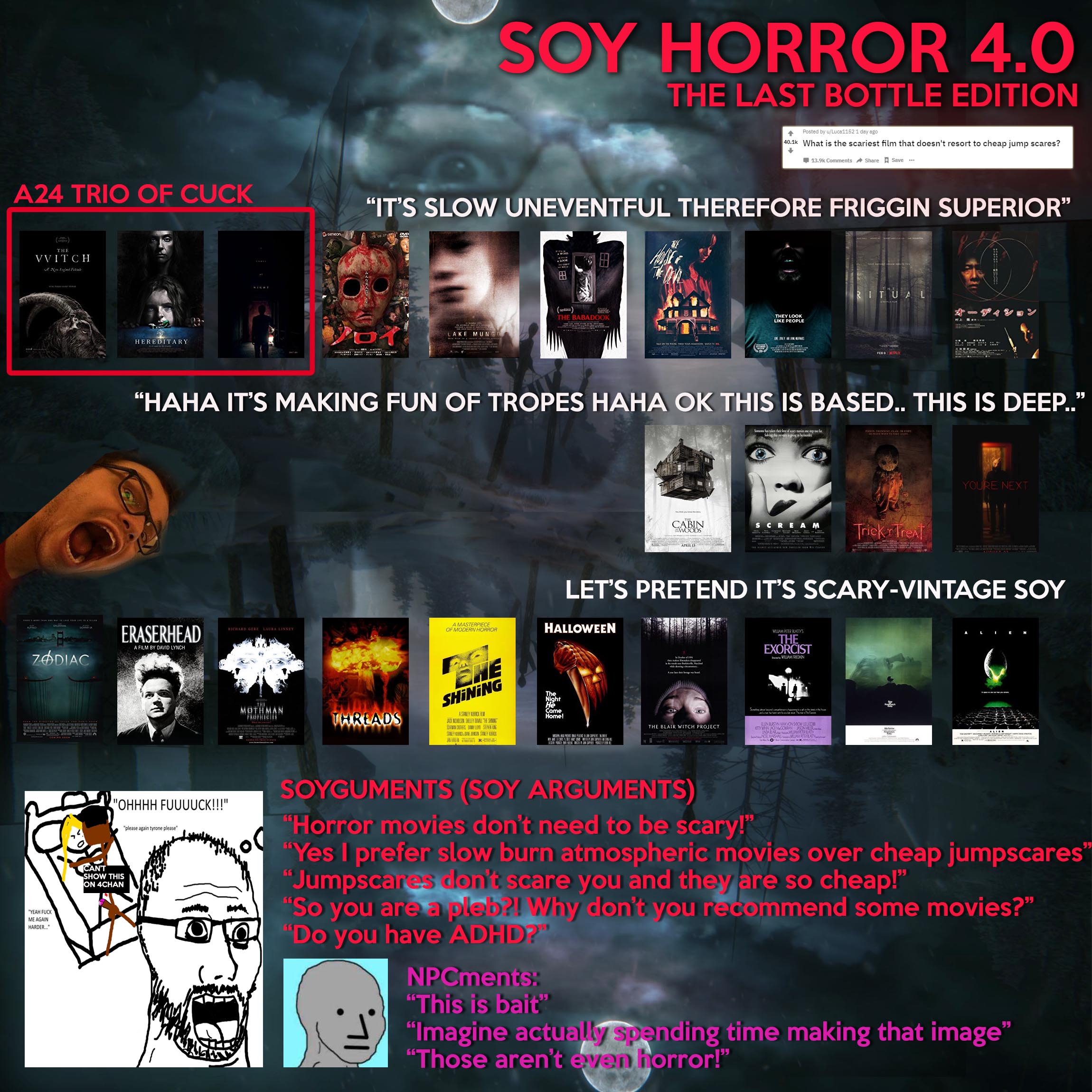 >>4132182 Возможно, но для тебя он покажется высером. Пока ты будешь спрашивать, а чему тут пугаться, люди с другим мышлением будут трястись. И обратное, от чего ты обосрешься, они будут номинировать как комедию.