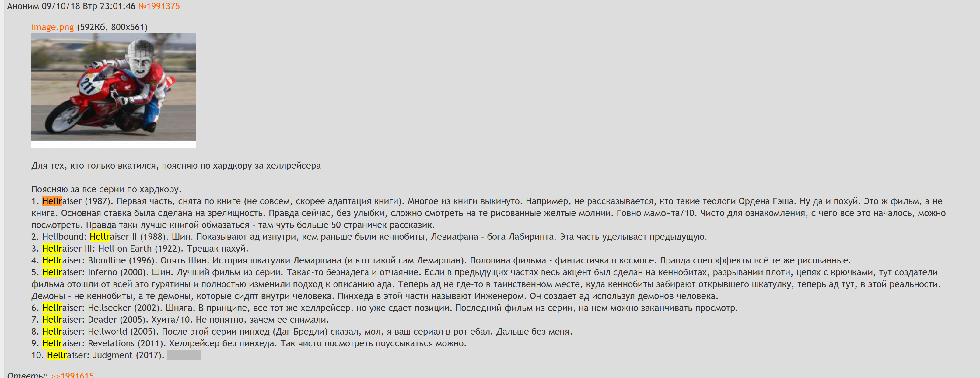 >>4137291 Ну там первый самый топовый, у тебя в принципе адекватная оценка. Продолжения — из серии "будем занедорага обстебывать сам факт наличия сиквелов и всякий раз высасывать возвращение маньяка из пальца". Но меня эта беспринципная тупость и забавляет, плюс много камео от слэшерных актеров.