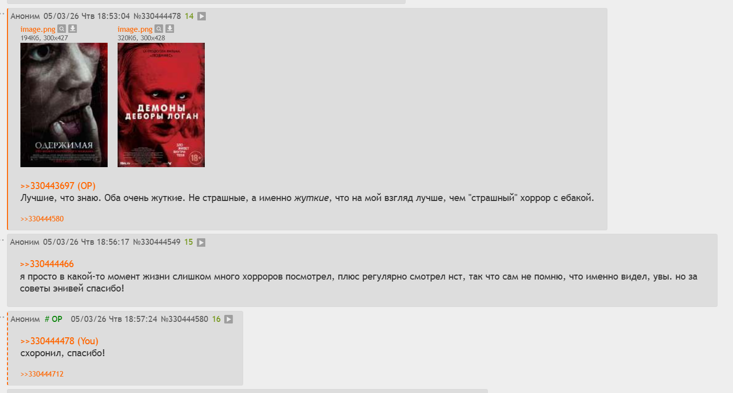 >>4132125 К сожалению, нет. Последние пару лет как-то нет большого желания что-либо смотреть. И ещё меньше желания писать отзывы. Полгода назад взялся за франшизу из 6-ти фильмов. Посмотрел 5 и дропнул последнюю часть на середине - без какой-либо особой причины. Видимо, просто устал. Теперь надо будет заново всё пересматривать. И вообще, надо уже снова начать активно смотреть кино. Знаю что прозвучит как заезженная пластинка, но пока что у меня в ближайших планах (ближайших, но растянувшихся на год) пересмотреть Look Away и Гадкую сестру. Где-то на фоне ещё есть планы наконец-то посмотреть Excision. А ещё периодически возникает желание пересмотреть Иннкиперов.