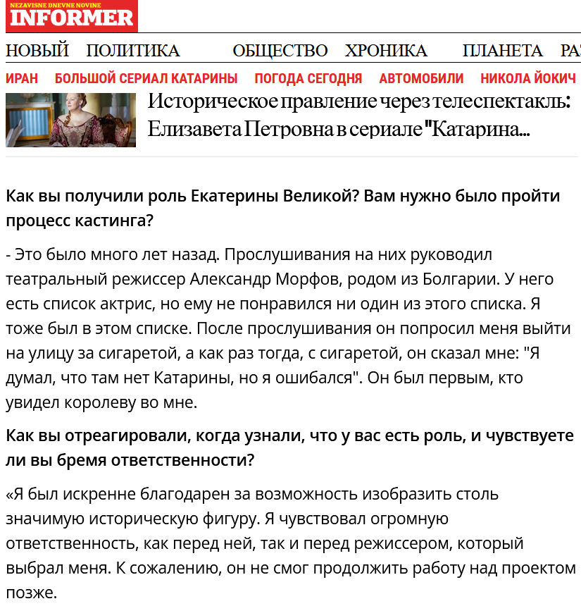 >>4141581 >Марина Александрова в эксклюзивном интервью Informer рассказала, что режиссер Александр Морфов сказал ей, что из всех девушек на прослушивании он увидел императрицу только в ней! Читайте полное интервью на нашем портале, а сегодня в 21:00 смотрите новый эпизод сериала «Екатерина Великая».