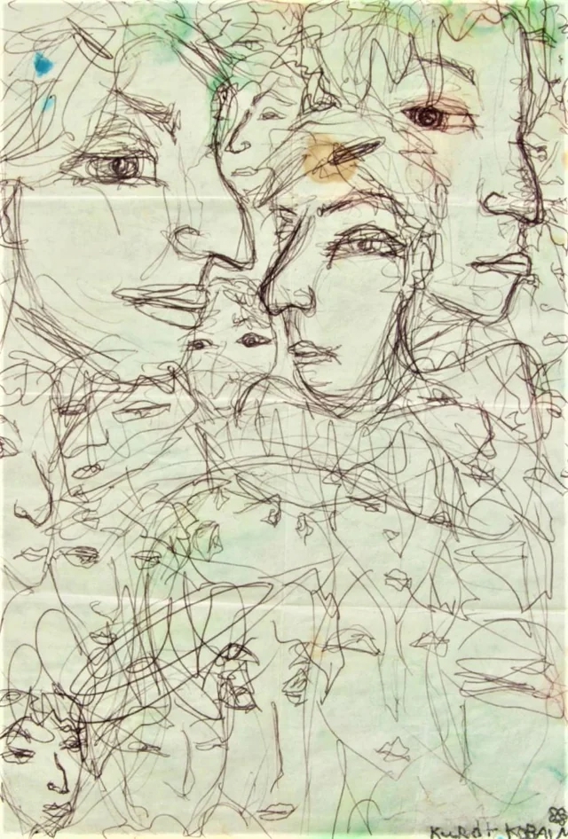 Внутренний разворот кассеты Fecal Matter «Illiteracy Will Prevail». Рисунок бэйна. Он был явно вдохновлен дизайном обложки "Revolver" Битлз.